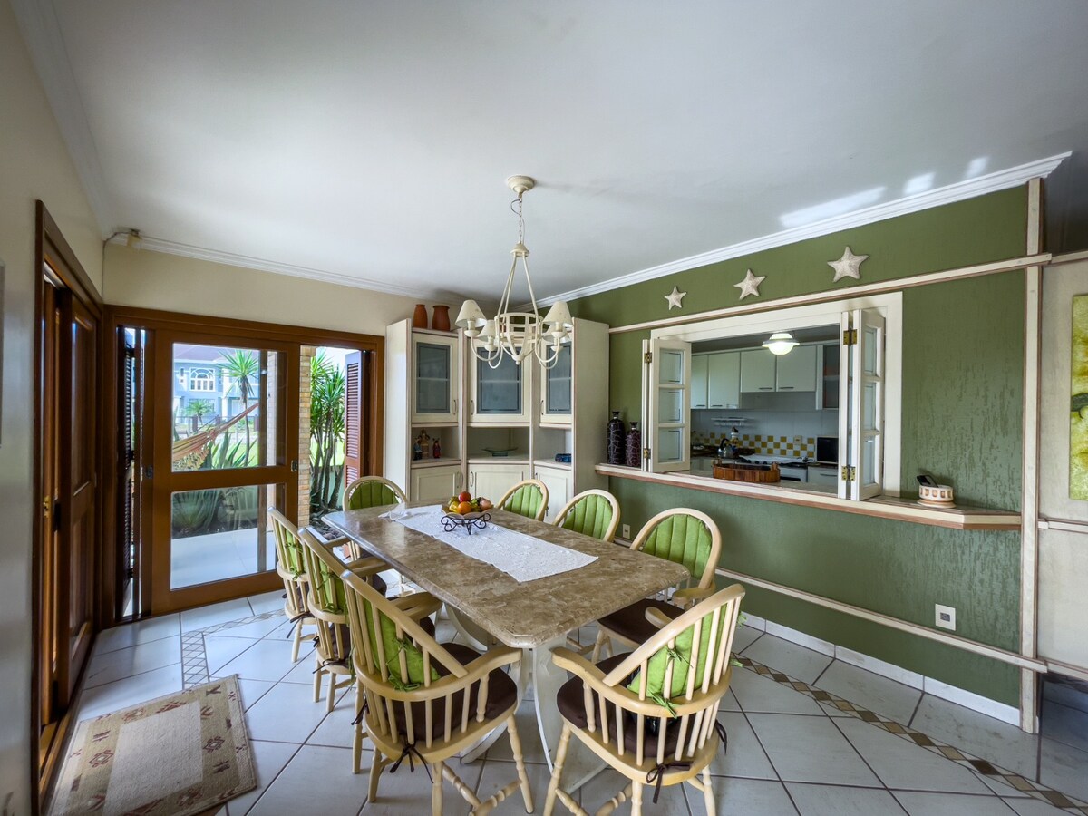 Lees DE HUISREGEL voordat JE boekt. Je stemt ermee in om ze na te leven wanneer je reserveert. Huis met 3 slaapkamers, zijnde 1 queensize bed suite, 1 tweepersoonskamer en 1 slaapkamer dienstmeid met een tweepersoonsbed. Airconditioning in alle afhankelijkheden. Zwembad op zonne-energie, wifi, pooltafel, buiten- en binnenbarbecue, oven, micro, enz. Het huis is geschikt voor maximaal 8 personen, met de woonkamer sofa. Adres: Bairro Atlântida-Cidade Xangri-la