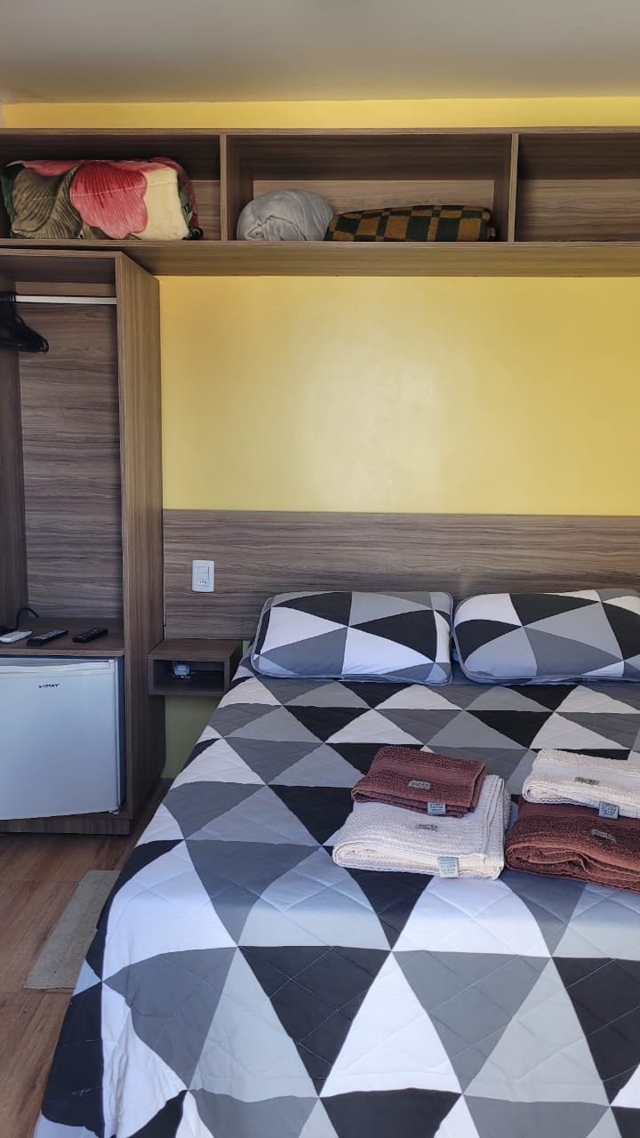 Bem-vindo ao seu espaço de descanso na Praia do Cassino. A acomodação oferece um quarto privativo, sala integrada à cozinha com sofá-cama e um mezanino de pé-direito baixo com três colchonetes. Conta com lavanderia compartilhada e estacionamento em frente ao imóvel, monitorado por câmeras 24h. A região é tranquila, segura e ideal para quem busca conforto e privacidade.