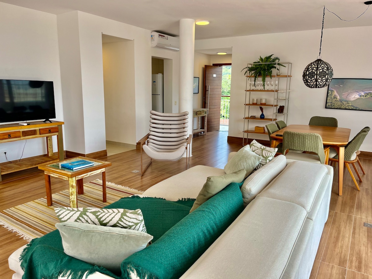 Lindo lugar Condomínio novo. Studio com 51m, mobilidado, eletrodomesticos, Enxoval Completo e de qualidade. Área de lazer completa na cobertura (piscina com borda infinita, saunas seca e Úmida, academia e brinquedoteca. A vista da área de lazer é espetacular! Você pode acessar a praia do Flamengo ou Sete Fontes por trilha, se preferir vários passeios de Escuna ou barco, tudo isso disponível a menos de 200 metros do Condomínio. Não perca esta oportunidade.