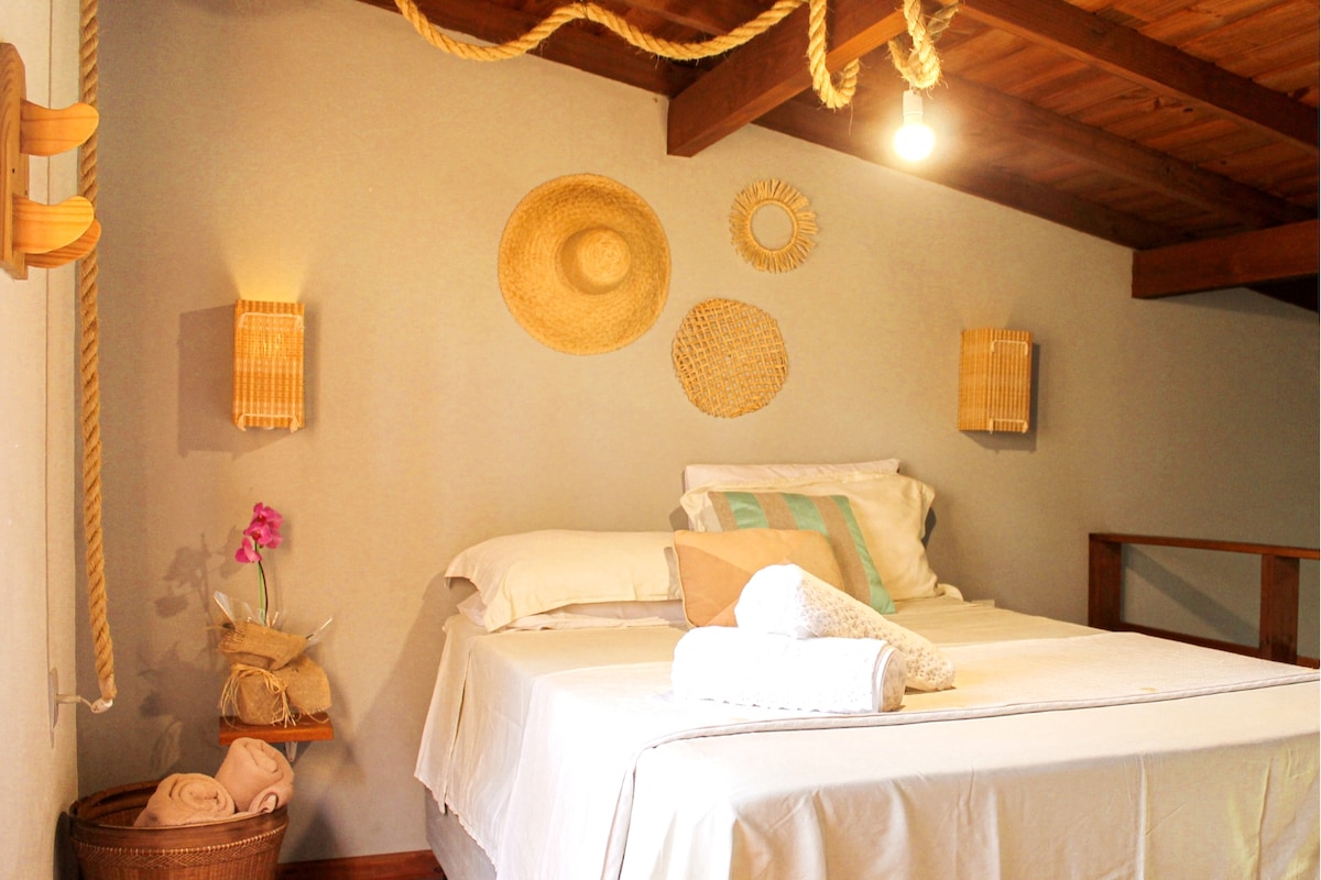 Brede, comfortabele, privé, individuele toegang Ideaal voor jonge stellen of 4 personen, goed met leven 5 minuten van het strand met de auto (2 km); 1 km van centrinho. Rustige plek, veilige, gemakkelijke toegang tot de Rosa en andere stranden van de regio. - Queensize bed met box queen bed en airconditioning Q en F -Sala com TV 32 Smart, bicama p/ 2 singles, fan Heerlijke boetiek met hangmat en prachtig uitzicht op de bergen - Complete en functionele keuken -Gardin en barbecue (gemeenschappelijk gebruik) - Wifi-stabiel glasvezel 100mb