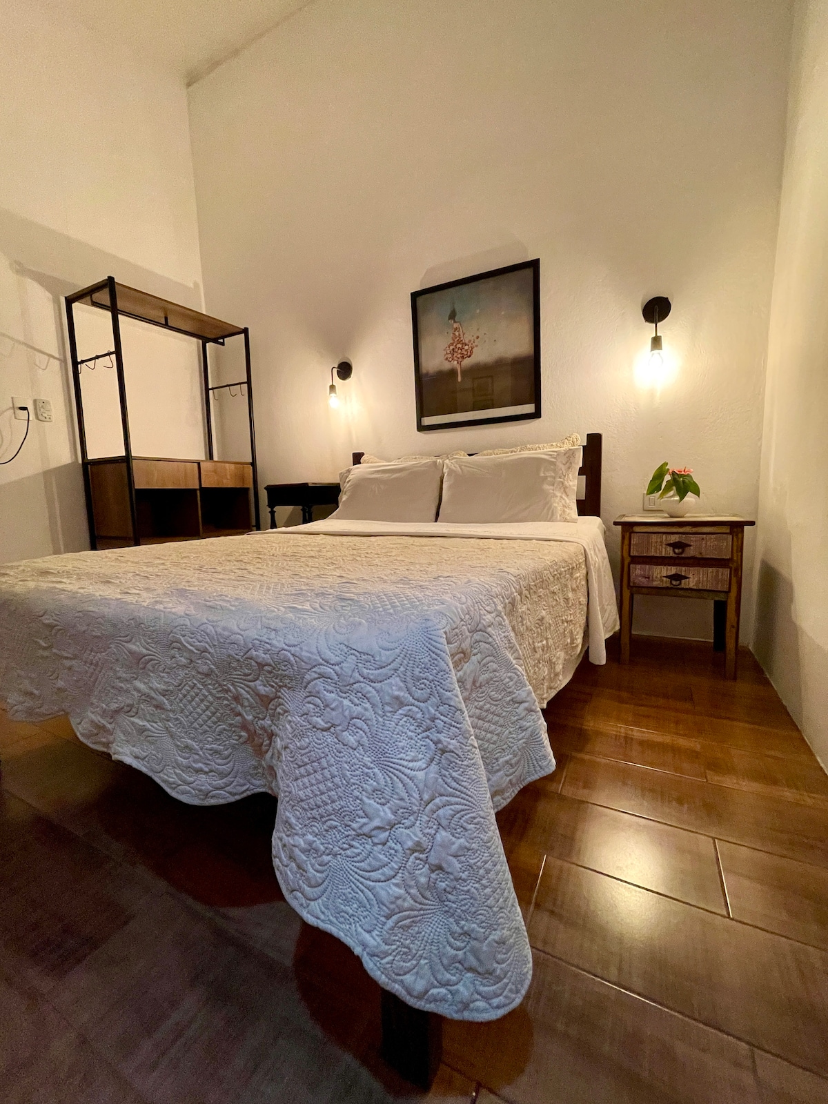 Embrace comfort in this peaceful, safe and beautifully located place, perfect for couples. Suíte Lilac is 100m from Praia do Pontal, 300m from the Historic Center and 1.5km from Paraty Bus Station. The suite offers a private bathroom with hot shower, air conditioning, ceiling fan, free Wi-Fi (440MB), flat screen TV with Roku, minibar, mirror, couple bed and bedside tables with lamps.