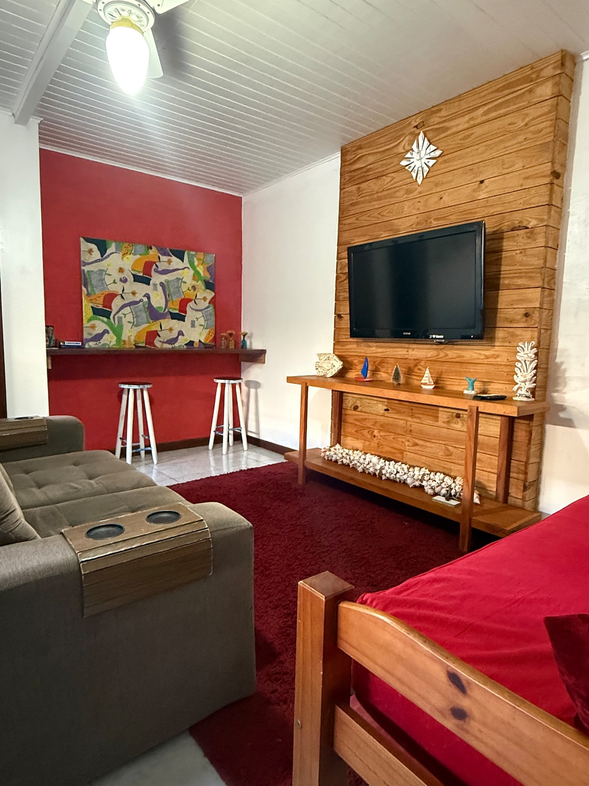 The guesthouse is close to Rua das Pedras and from Ferradura beach (around 500 mts from both places). Herein is a quiet place, good to rest and relax. Ideal for couples, the house has a balcony, a deck in the living room and bedroom, living room, kitchen for small meals, covered barbecue area, SmarTv, wi-fi internet, bathroom, outdoor shower, indoor parking and a large grassy area.
