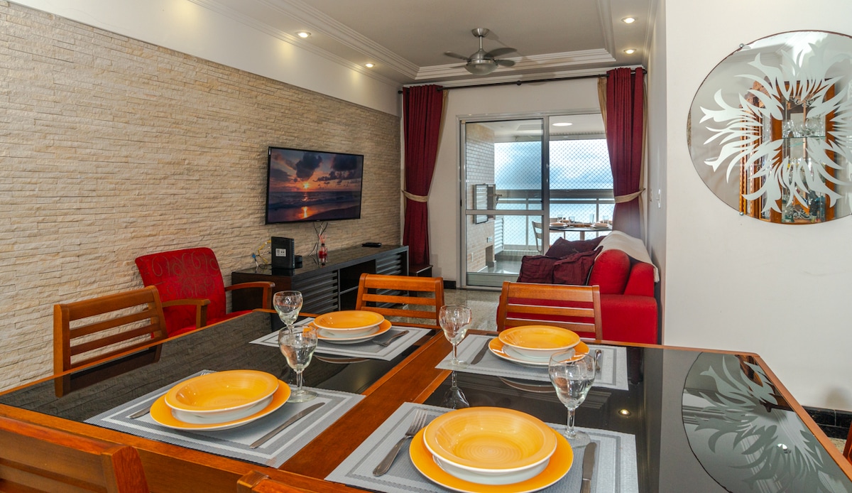 Appartement van 110m², maximaal 8 personen, met uitzicht op zee, met barbecue en gastronomisch balkon. Beste locatie in Mongaguá,degenen die de stad kennen, weten dit.WI-FI BESCHIKBAAR. Appartement Cond. Lila Mongaguá strandfront Appartement heeft 3 slaapkamers allemaal met queensize bed, volledige keuken, gastronomisch balkon met barbecue, 50 inch tv-kamer in de woonkamer, plafondventilator in de woonkamer en kamers met afstandsbediening, ruimte voor 2 auto 's overdekte garage. Volledige voorkeur voor gezinnen.