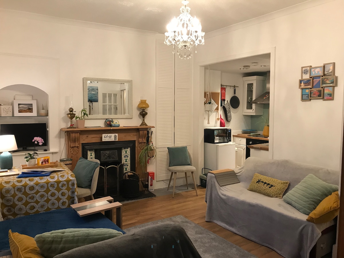 Spacious garden flat with its own entrance, which is per garden off Belhaven Terrace Lane, postcode G12 9LZ). The cobbled lane has street lighting, a number of mews cottages and is widely used especially during the day. Living room/ kitchen has full cooking facilities as well as washing machine and iron/ board. Bedroom is split into main area and alcove with a mattress on floor, could be used by 3rd person (eg child) by agreement.