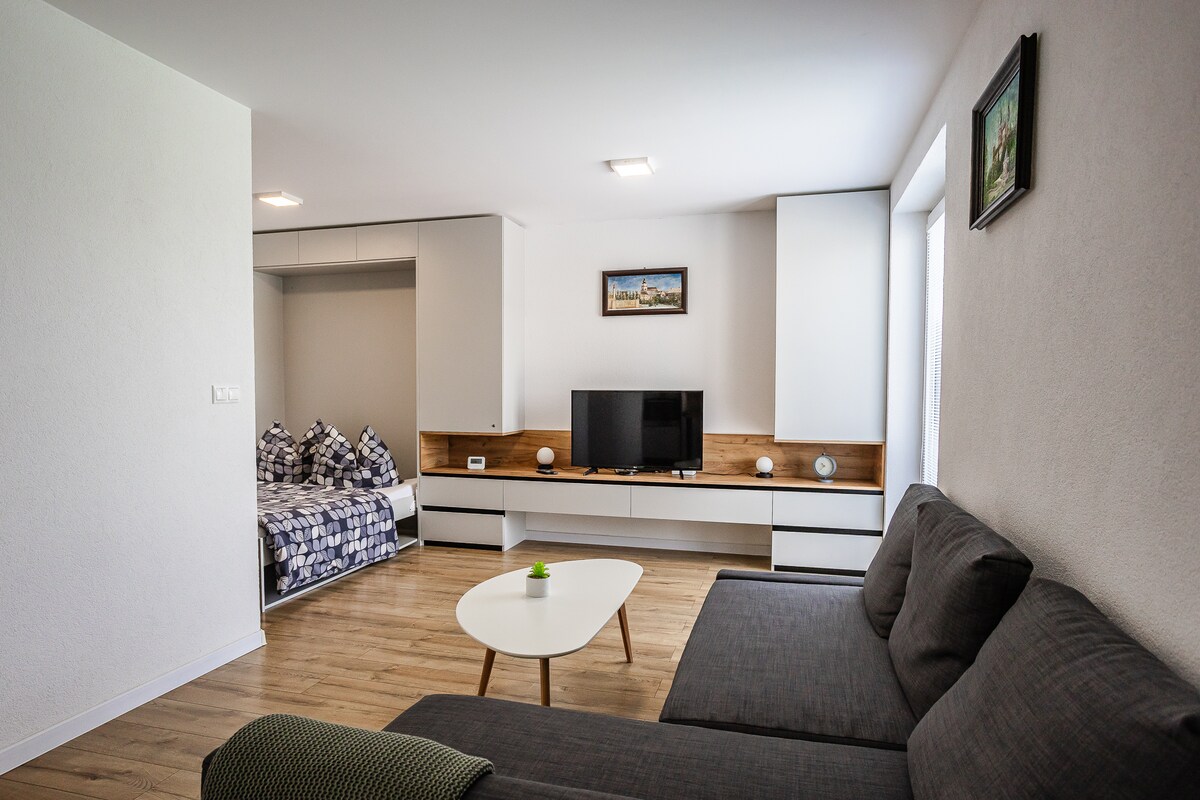 Wij bieden u de mogelijkheid om te verblijven in een studio in een nieuw gebouwd appartementengebouw, met uitzicht op het kasteel van Bojnice, waar u uw voeten kunt uitstrekken en ontspannen in een rustige, stijlvolle ruimte. De studio heeft een bed en een slaapbank, waar 4 personen comfortabel kunnen slapen. Het is uitgerust met een complete keuken en natuurlijk voorzien van airconditioning. Het is gelegen in een rustig deel van de stad, waar u in de verte onze mooiste heuvel Kľak kunt zien, aan de andere kant het kasteel van Bojnice. Het is 15 minuten lopen naar Bojnice. Er is een uitstekend café in de buurt.