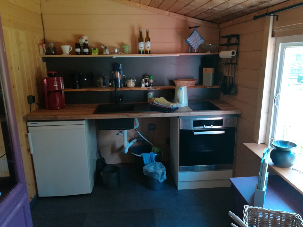 De "Abhanger" (ongeveer 20 m2) is op onze kleine Tuin achter de schuur, op een weiland onder bomen. Een mooie badkamer ligt op slechts een paar stappen afstand. Afhankelijk van de situatie word je begroet door de haan Oskar, Leon, onze vriendelijke maar energieke Briard, of de kater Gismo; de kippen lopen meestal vrij rond op het terrein. Op de aangrenzende weide grazen ezels en geiten. Hier kan iedereen verdwalen in vrede, gewoon hier op deze plek zijn.