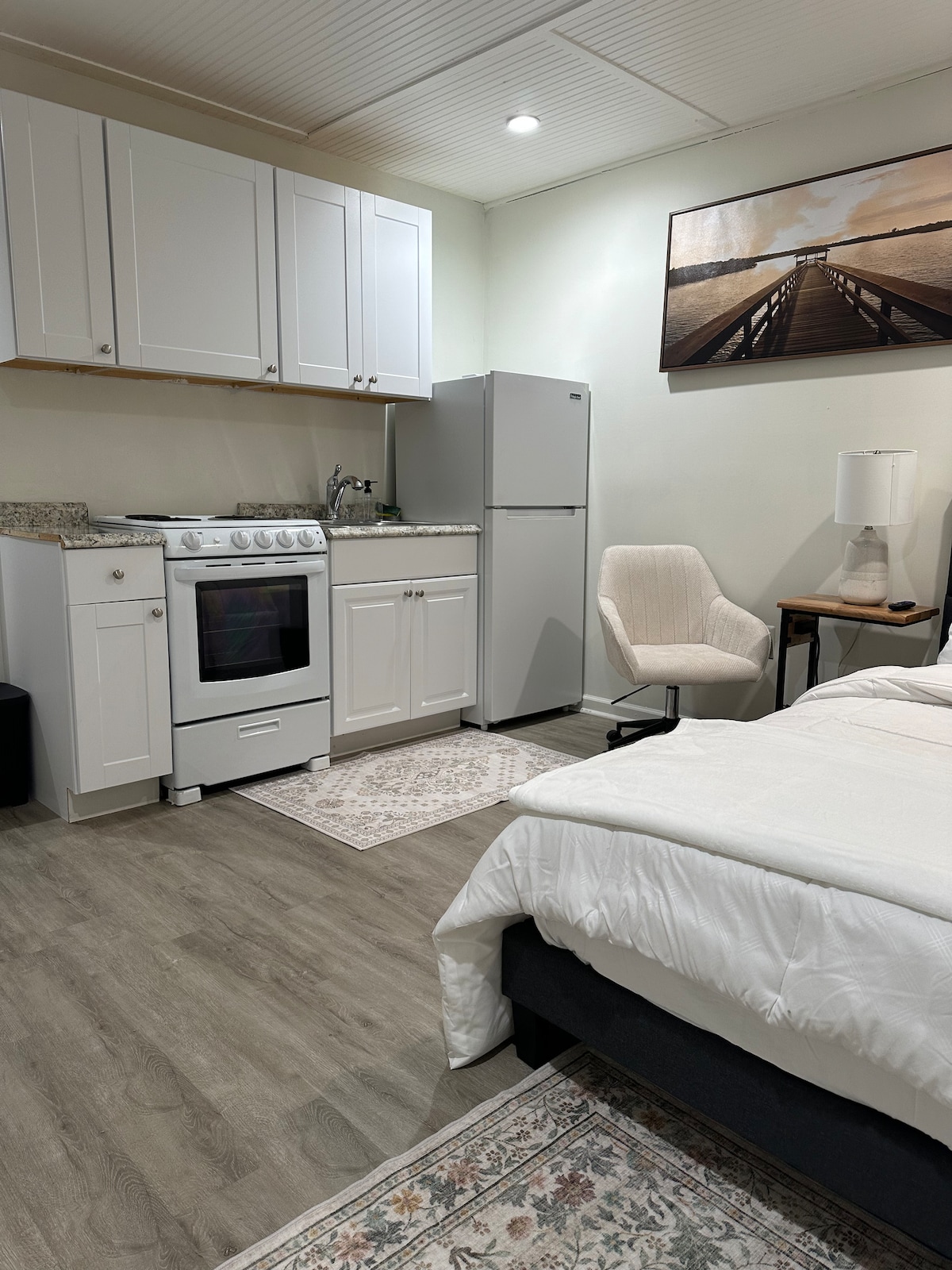 Deze ruimte is net gerenoveerd en heeft nu een eigen badkamer op hetzelfde niveau! De bovengrondse verhuur heeft een complete badkamer, queensize bed en kitchenette (kleine koelkast, magnetron en koffiezetapparaat) om ervoor te zorgen dat je de basisbenodigdheden hebt die nodig zijn voor het verkennen van de omgeving. Sleutelloze toegang zorgt voor eenvoudig inchecken. Gelegen in een rustige woonstraat, krijg je de rust die je nodig hebt voor je tijd aan het werken of verkennen van de omgeving.