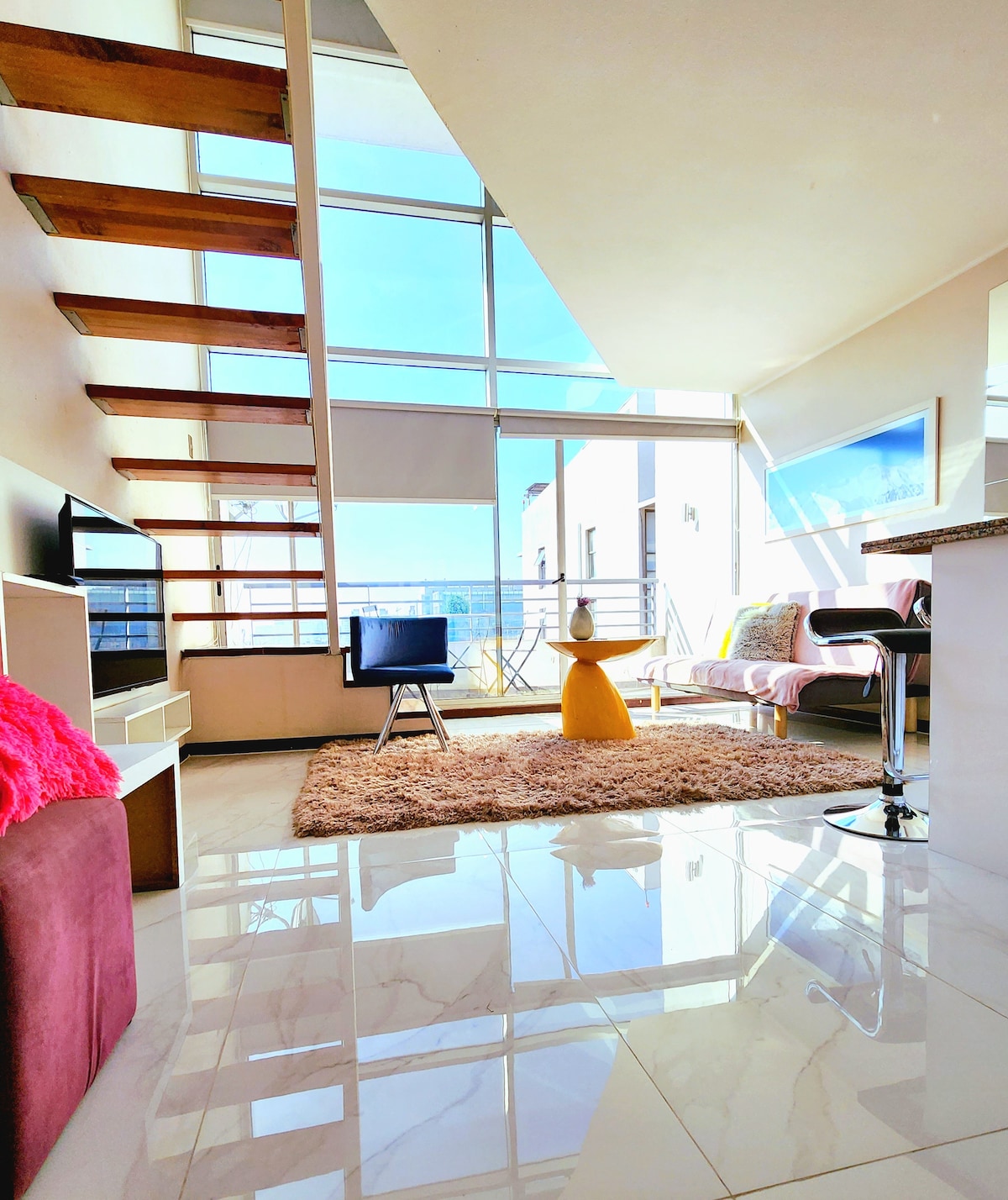 Loft Vista Sky is een duplex appartement met een eigen terras en een bevoorrecht uitzicht op de skyline van de stad. Deze duplex bevindt zich op de laatste twee verdiepingen van een gebouw met medische locatie in de beste buurt van het centrum van Santiago (openbare buurt) toegang tot de hoofdstraat van de stad "Alameda" die ten oosten van de stad av wordt genoemd. Providencia en av.apoquindo. Op de ondergrondse verdieping van het appartement vind je 2 supermarkten, cafés zoals Starbucks en een eetplein.