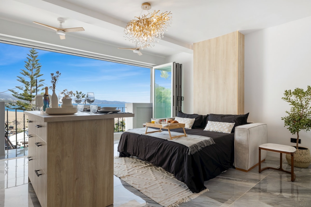 Studio aan het strand in Marbella | Zwembad op het dak en op zeeniveau | Snelle wifi Verblijf direct aan het strand van Marbella in deze stijlvolle studio van 40 m² met een zijterras met uitzicht op zee, een kingsize bed + slaapbank, airconditioning, plafondventilator, smart-tv, snelle wifi en een speciale werkruimte. Geniet van twee zwembaden: een zwembad op zeeniveau bij het zand en een zwembad op het dak met een panoramisch uitzicht op de Middellandse Zee. Volledig uitgeruste keuken, strandvoorzieningen, SUP board beschikbaar. Loop naar het strand en de oude stad, winkels en restaurants - geen auto nodig