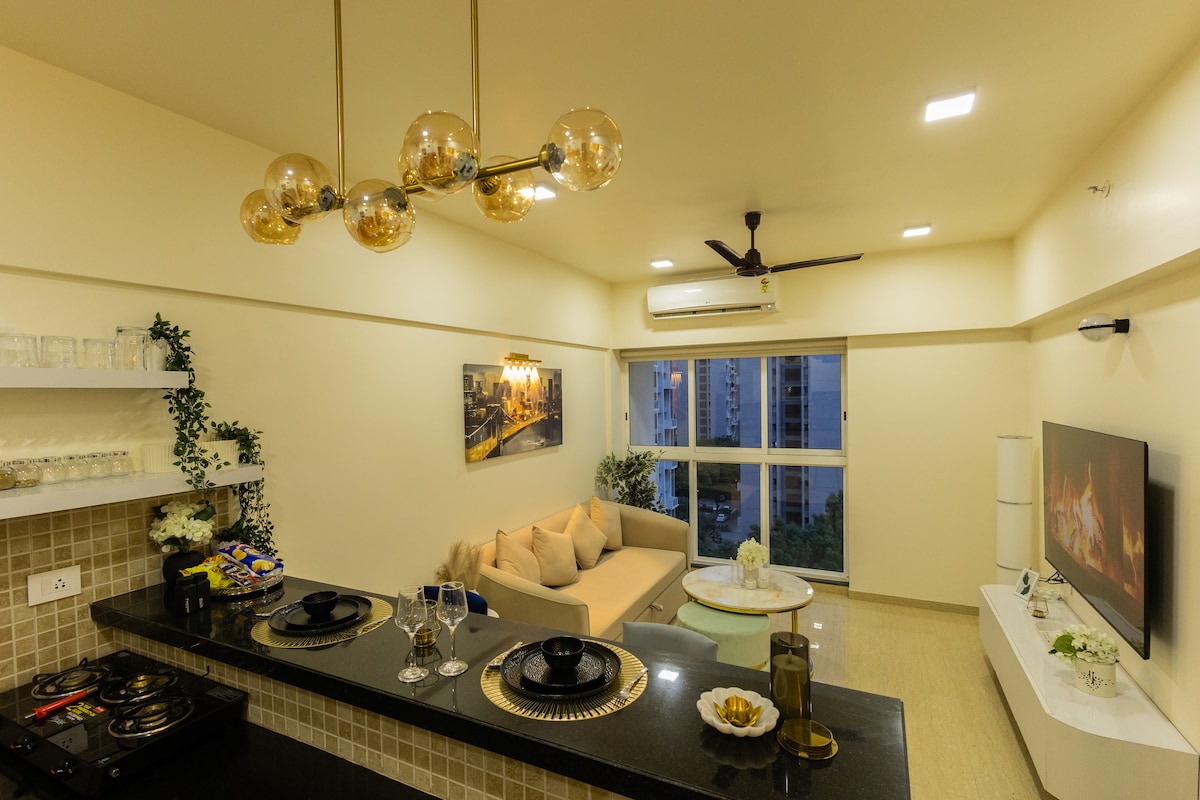 Luxe Riverside Golf Resort Lifestyle bij ons thuis op de HOOGSTE VERDIEPING met een ADEMBENEMEND uitzicht, gelegen op MCA Stadium, Pune. Wifi met volledig airconditioning 1BHK-appartement, in een zeer veilig omheind complex, met luxe voorzieningen zoals Cricket Ground, 45 hectare grote golfbaan, 1 km lange Riverside promenade met vaarfaciliteiten, 25 m zwembad met een apart babyzwembad, Library Lounge, Party Lounge, Party Hall, Gymnasium met yoga- en meditatiefaciliteiten, een privétheater van 30 zitplaatsen.