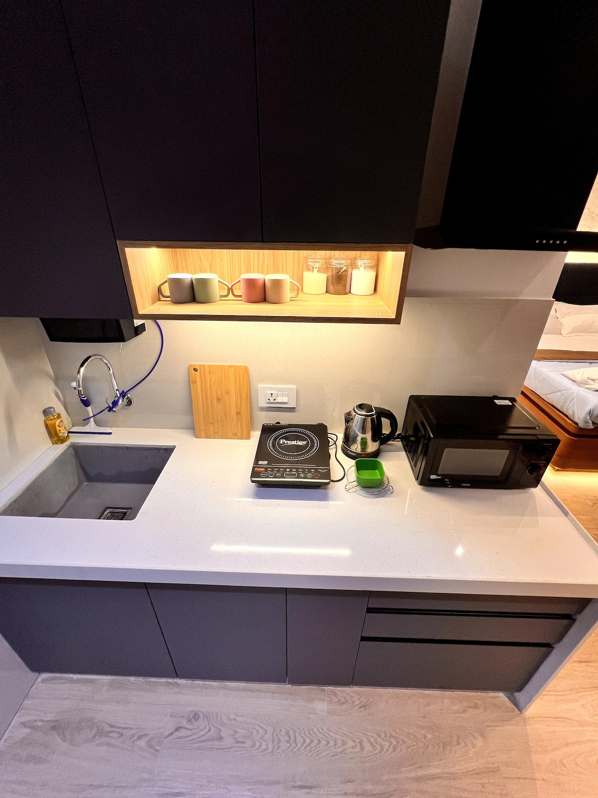 Stap in Stillspace — een design-geleide studio waar rust en intelligent leven samenkomen. Lichten passen zich aan je stemming aan, muziek stroomt zachtjes door de kamer en het huis wordt uitgeschakeld wanneer je welterusten zegt. Elk detail is gemaakt om het stadsleven moeiteloos te laten aanvoelen - doordacht, beheerst en stilletjes luxueus. Slim wonen met Alexa voor naadloos comfort Comfortabel queensize bed, zacht beddengoed en samengestelde lounge Compacte, goed uitgeruste keuken Centrale ligging — op enkele minuten van Koregaon Park, Kalyani Nagar cafés en het nachtleven