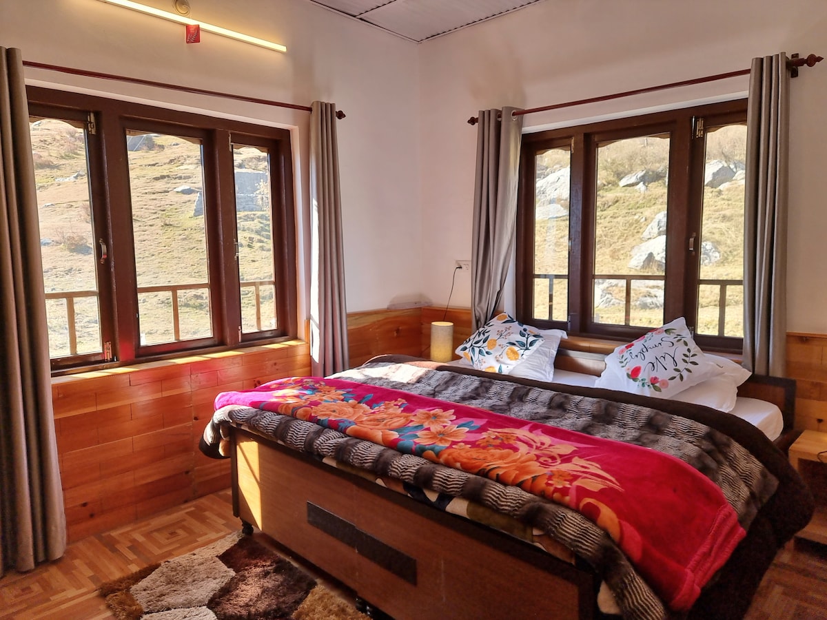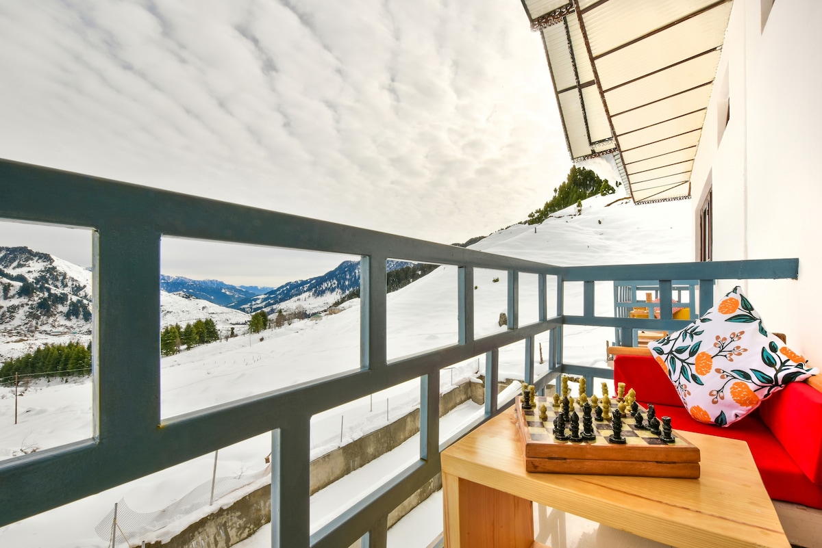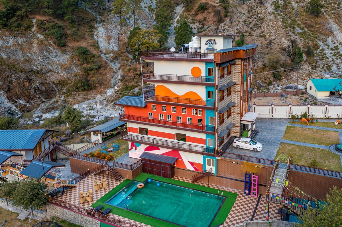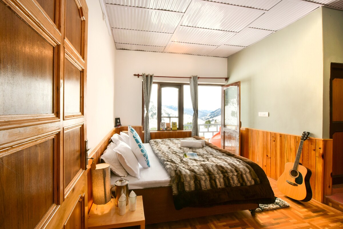 Een en-suite kamer met een tweepersoonsbed, een televisie en een balkon met uitzicht op de bergen. Weggestopt in de uitlopers van besneeuwde Dhauladhars en direct aan een stromende rivier, biedt Zostel Plus Kareri een ontsnapping met spannende functies, zowel binnen als buiten.