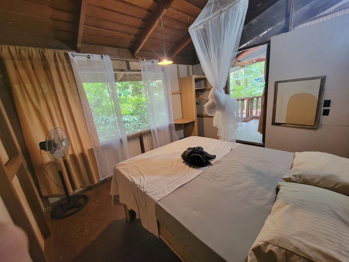 Verhoogde vrijstaande junglehut met uitzicht op de lagune, oceaan en Caño Island. Traditioneel gebouwd met witte wandelstok en ingericht met muurschilderingen. Ontspan en geniet van prachtige zonsondergangen vanuit de hangmat of je balkon. Neem een kano en peddel over de lagune om bij een eenzaam strand te komen. Volg de voetafdrukken van de Tapir langs het bamboepad of wandel naar een mangrovestrand. Wij bieden een eigen Cacao Tour, Kano Tour en Nachttour en organiseren rondleidingen naar onder andere Corcovado of Caño Island.