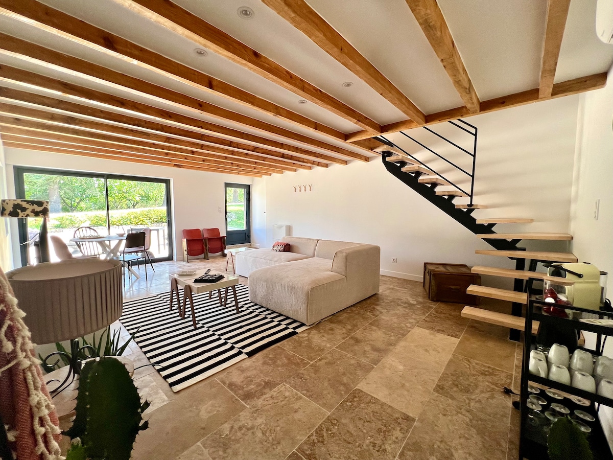 In dit atypische en nieuwe appartement vind je al het comfort dat nodig is voor 3 personen. Gemaakt in een oude wijnmakerij, bent u op een rustige locatie op 3 minuten van Marmande. Groene ruimte en vrij parkeren op het terrein Bestaande uit een woonkamer op begane grond met uitgeruste keuken en welkomstplateau, zithoek. Boven, een bed in 160 x 200 en een bed in 90 x 190, een badkamer en toilet niet gescheiden Wij voorzien je van lakens, vergezeld van badlakens en beddengoed.