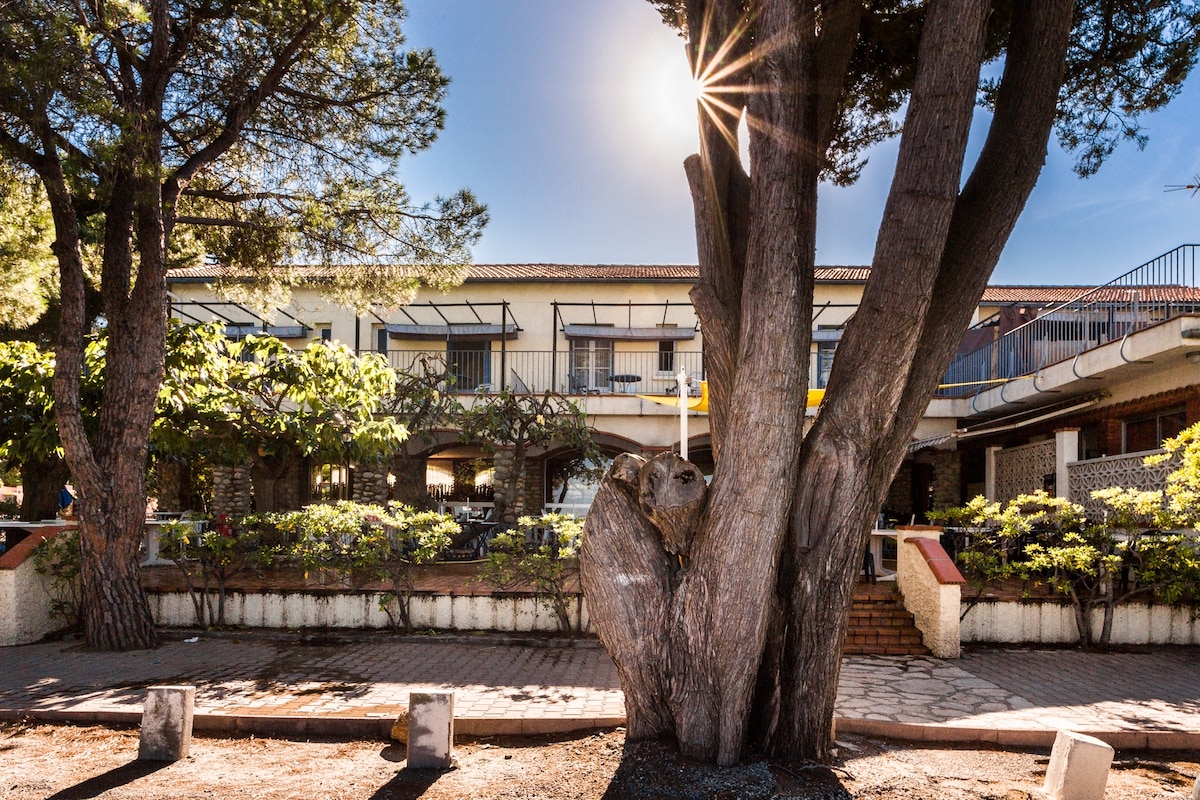 In het hart van een woonwijk heeft ons hotel ruime kamers in het hart van een dennenbos. De 24-uursreceptie biedt alle gemakken van een 3*. Grote bedden in 180, een grote Italiaanse douche en een mooi balkon voor boeken, hagedissen... Het verwarmde zwembad is geopend van begin mei tot eind september.