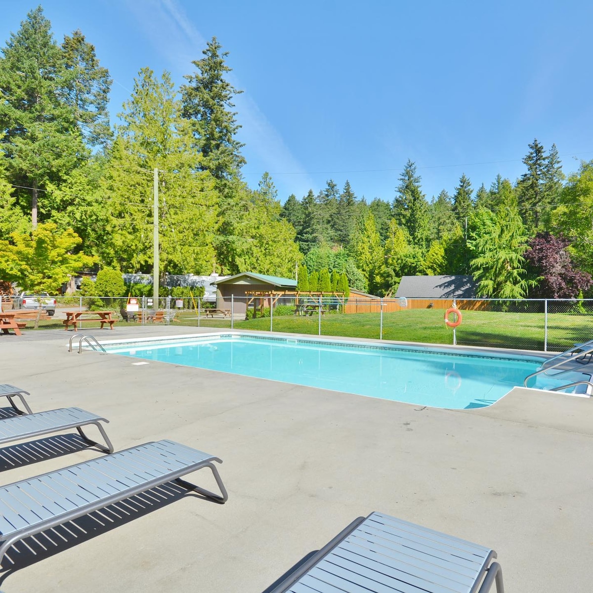 Wij bieden 1165 vierkante meter aan ruimte met airconditioning – twee queensize slaapkamers met fris beddengoed, een prachtige badkamer met bad en inloopdouche, en veel ruimte om te ontspannen. Moderne wasmachine, droger, koelkast, fornuis en vaatwasser. Je hebt een eigen overdekt terras met zit- en eetruimtes buiten, evenals het gebruik van een bubbelbad voor zes personen. Er zijn kajaks en een kano die je kunt gebruiken, als het getij het toelaat. 50 ampère snelle EV-oplader, RV-oplader.