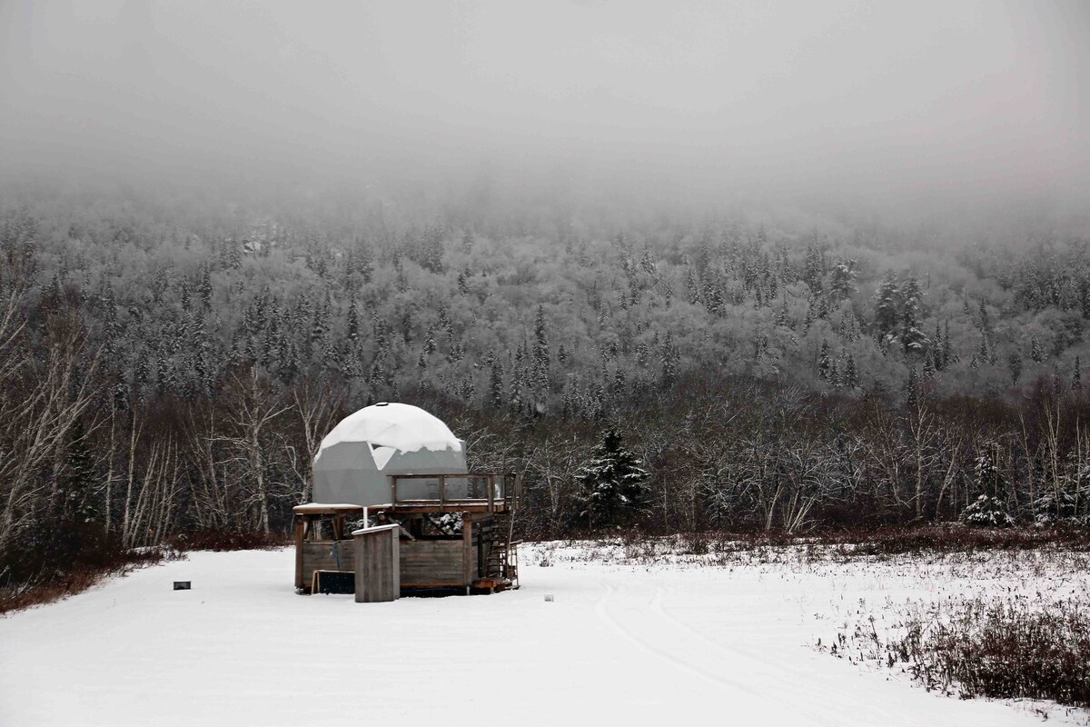 Een ideale rustige omgeving om je batterijen op te laden en energie op te doen. De koepels zijn een houten, geïsoleerde en geluiddichte constructie. Gelegen op het resort Méandre, omgeven door 40 hectare land met een 3 km lange wandelroute op het terrein, grenzend aan de Croche-rivier. Rivier tubing/kajakken/kanoën/SUP, wildlife watching, off-piste langlaufen, sneeuwschoenwandelen en hangmatten. *KORTE TERMIJN VERHUUR GEACCEPTEERD, 1 DAG EN MEER, NEEM CONTACT MET ONS OP*