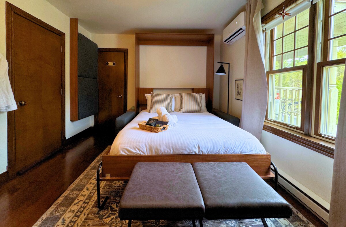 300 sq. ft. - 1 bed Kitchenette: Meubilair: tafel met 1 stoel & bank 2-persoons kookplaten: kleine broodrooster, inductiekookplaat, magnetron met ingebouwde afzuigkap Borden - Cookware Afwasaccessoires Slaapkamer hypoallergene beddengoedkussens Houten afdekking Glazen douche met regenpommel Magnetron Keurig koffiezetapparaat en minikoelkast LCDTV Desktop en stoelen