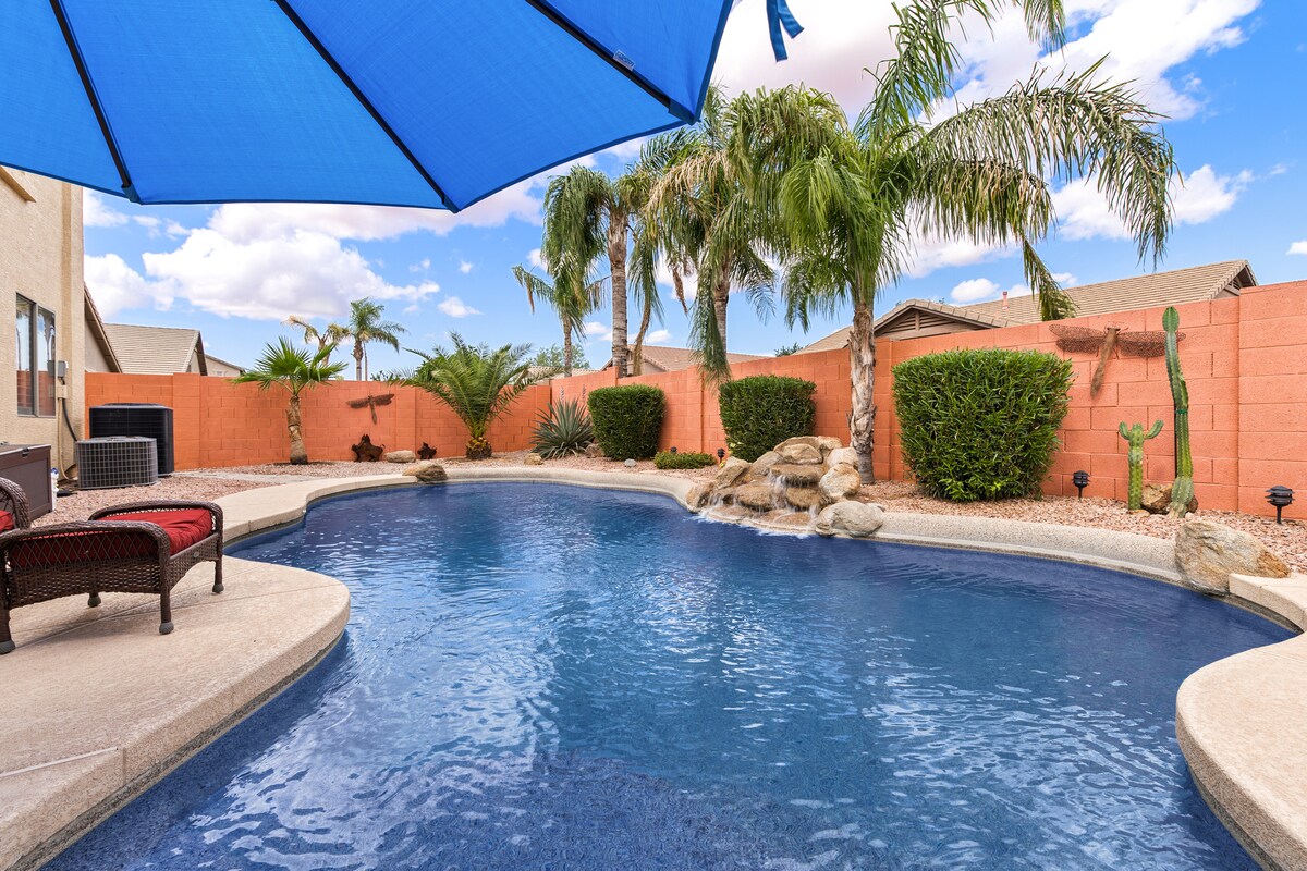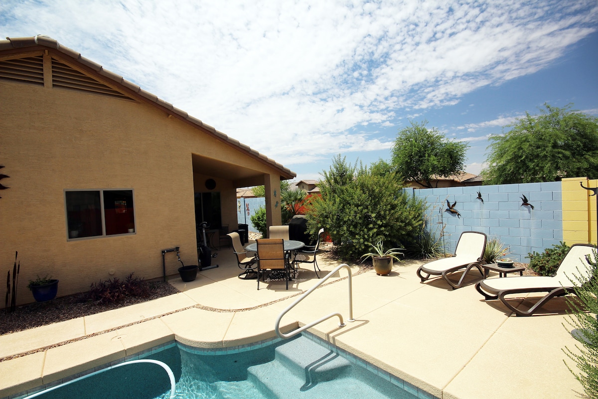 Woestijnoase met privézwembad (niet verwarmd), barbecueplek, volledige keuken, kingsize bed met Tempurpedisch matras in Master met inloopdouche, groot bad en handgrepen voor gehandicapten in elke badkamer voor jouw gemak. Op loopafstand van HET PARK, 4 mijl naar de GOLFBAAN, minder dan 5 mijl naar SCHNEPF-boerderijen met een DIERENTUIN, 3 mijl naar ETEN en WINKELEN, 12 mijl naar het OUDE SPORTCOMPLEX, 29 mijl naar zoutrivier. 4 slaapkamers, 3 volledige badkamers, Pack n Play, wifi, kabel-tv, airco, kleurrijke gebieden voor geweldige selfies.