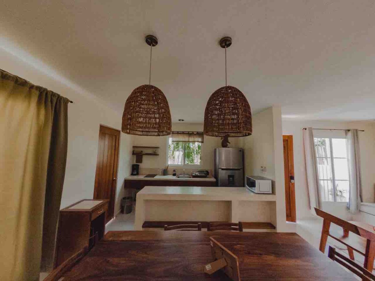 Zen Canto is een perfecte balans tussen afzondering in de jungle en de nabijheid van Tulum en de stranden, terwijl het ook gemakkelijke toegang biedt tot een verscheidenheid aan attracties. Als je rust in deze ruime slaapkamer, worden jullie omgeven door uitzicht op weelderig groen. De ramen omlijsten een prachtig groen uitzicht dat de schoonheid van het buitenleven uitnodigt, waardoor een verbinding met de natuur ontstaat. De badkamer met zijn ruime douche maakt het een perfect toevluchtsoord waar je in stijl kunt verwennen. Ideaal voor koppels.