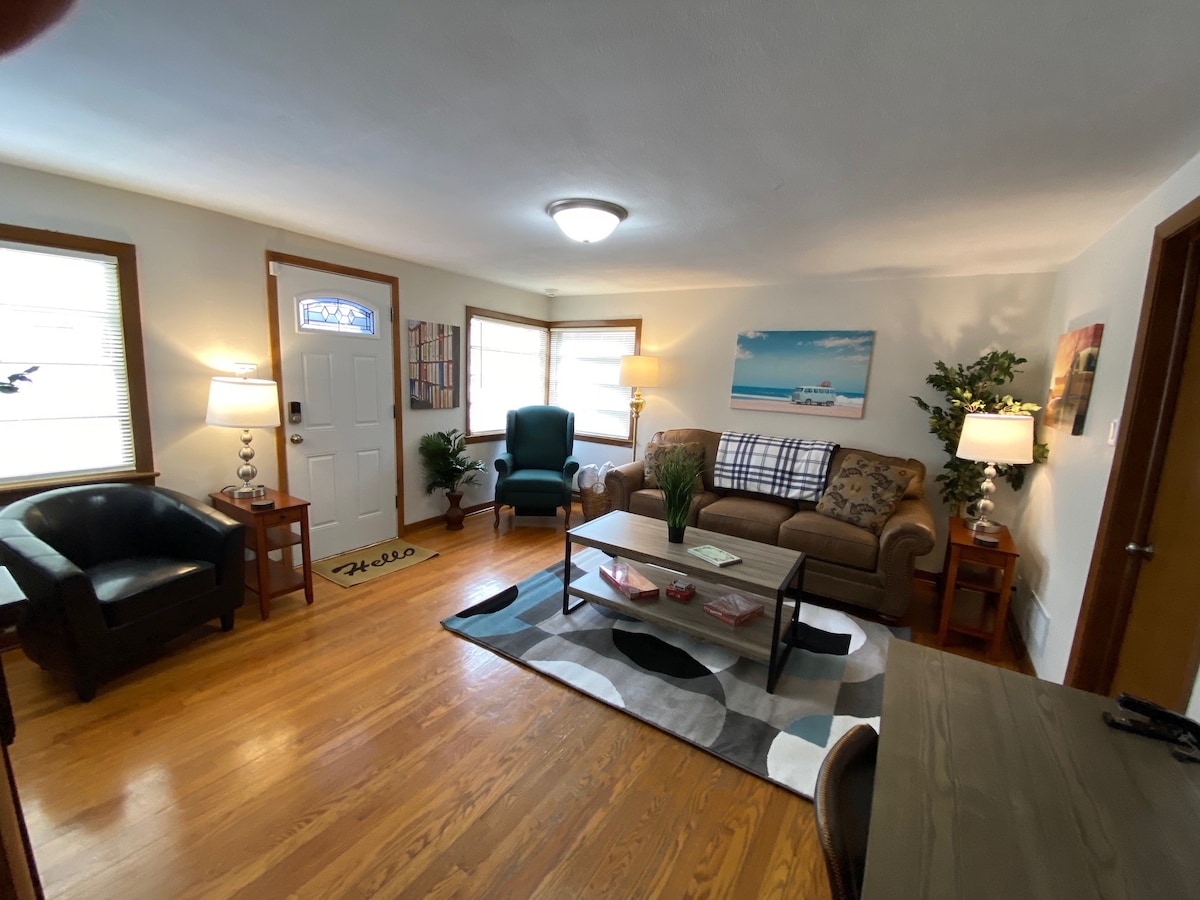 Welkom in de Main Street Belle - een ruim juweeltje van 3600 vierkante meter in het hart van het centrum van Racine, dat historische charme combineert met modern comfort. Belangrijkste kenmerken zijn: - 3 slaapkamers / 4 bedden (1 kingsize bed, 1 queensize bed, 2 vol) - volledig uitgeruste keuken met dubbele ovens - Gratis snelle wifi + smart-tv's (Netflix, Hulu, Max) - Eigen parkeerplaats, centrale airconditioning, wasmachine/droger - Vuurplaats buiten met stoelen voor ontspannende avonden Beleef het beste van het centrum van Racine - op een steenworp afstand van winkels, restaurants en het meer!