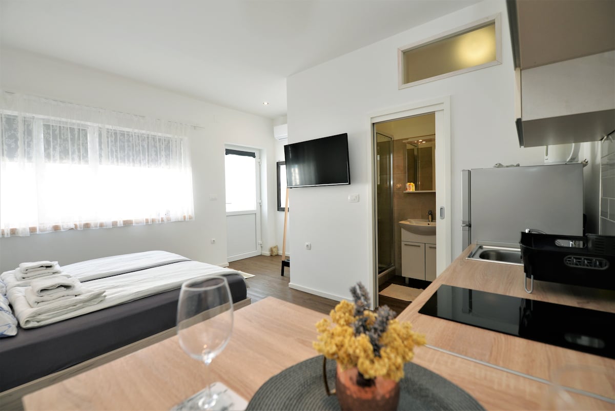 Welcome to this studio apartment, with stunning sea view, in the historical center of Zadar. From bed, it's like in a boat! The accommodation is located at the foot of the famous Sea Organ, the Greeting to the Sun, with this incomparable view of the sunset A parking space is reserved for you in front of the building, on the street side The studio is new, soundproofed, with equipped kitchenette, bathroom with shower and WC, balcony, TV, Wi-Fi, coffee machine The comfort of the bed is guaranteed !