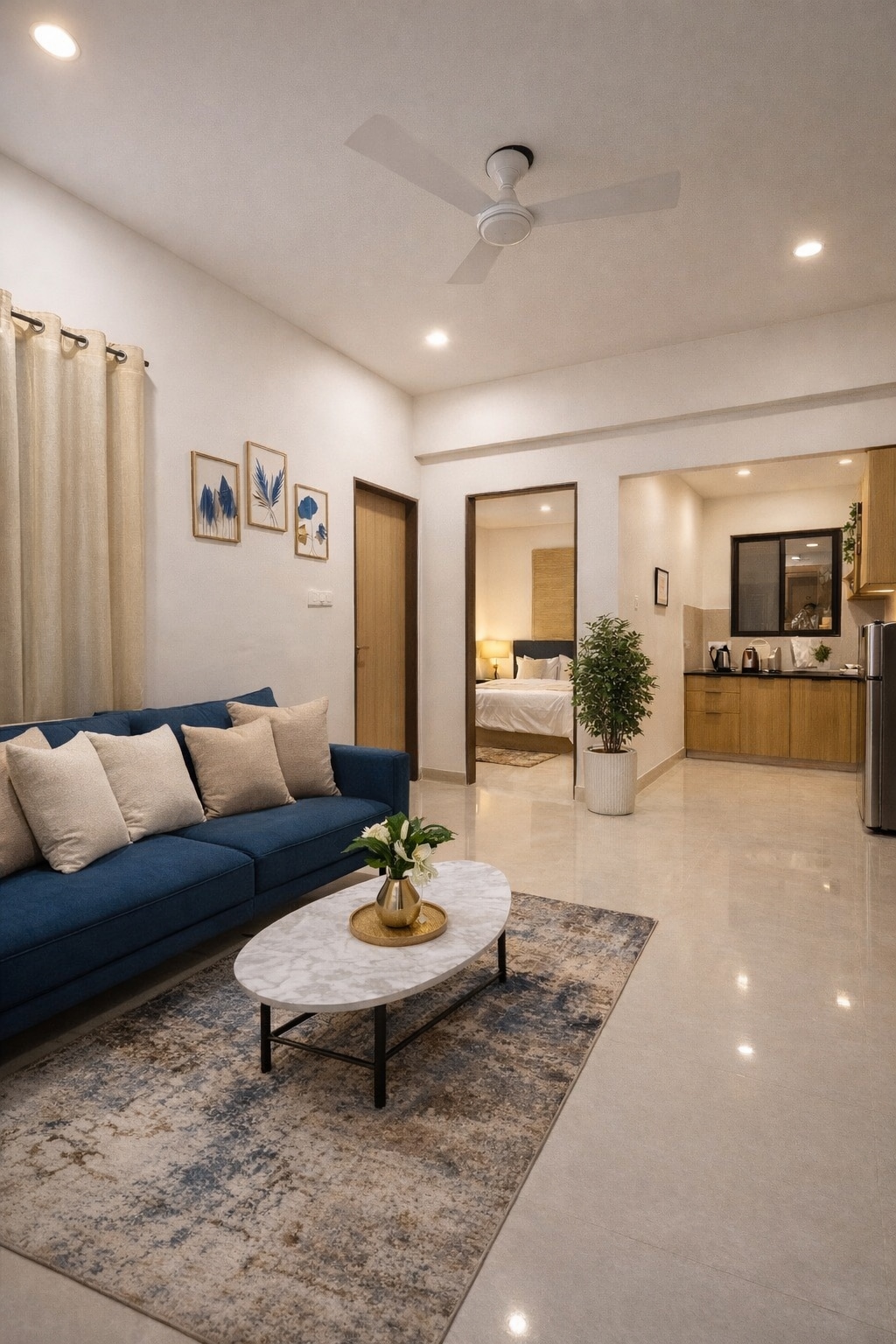 A self check-in, hotel-suite style studio in Vijay Nagar, Indore perfect for couples on a staycation, solo women travellers & working professionals. It has a queen bed, cozy lounge seating, TV, foldable work desk, Wi-Fi & a balcony. Thoughtfully designed interiors & a equipped kitchen, the space gives you the comfort of a hotel and the freedom of a home. 10 mins to Farzi Cafe & Piano Project 10 mins to C21 Mall 25 mins to Airport & Station Ideal for short/long & romantic stays in Indore.