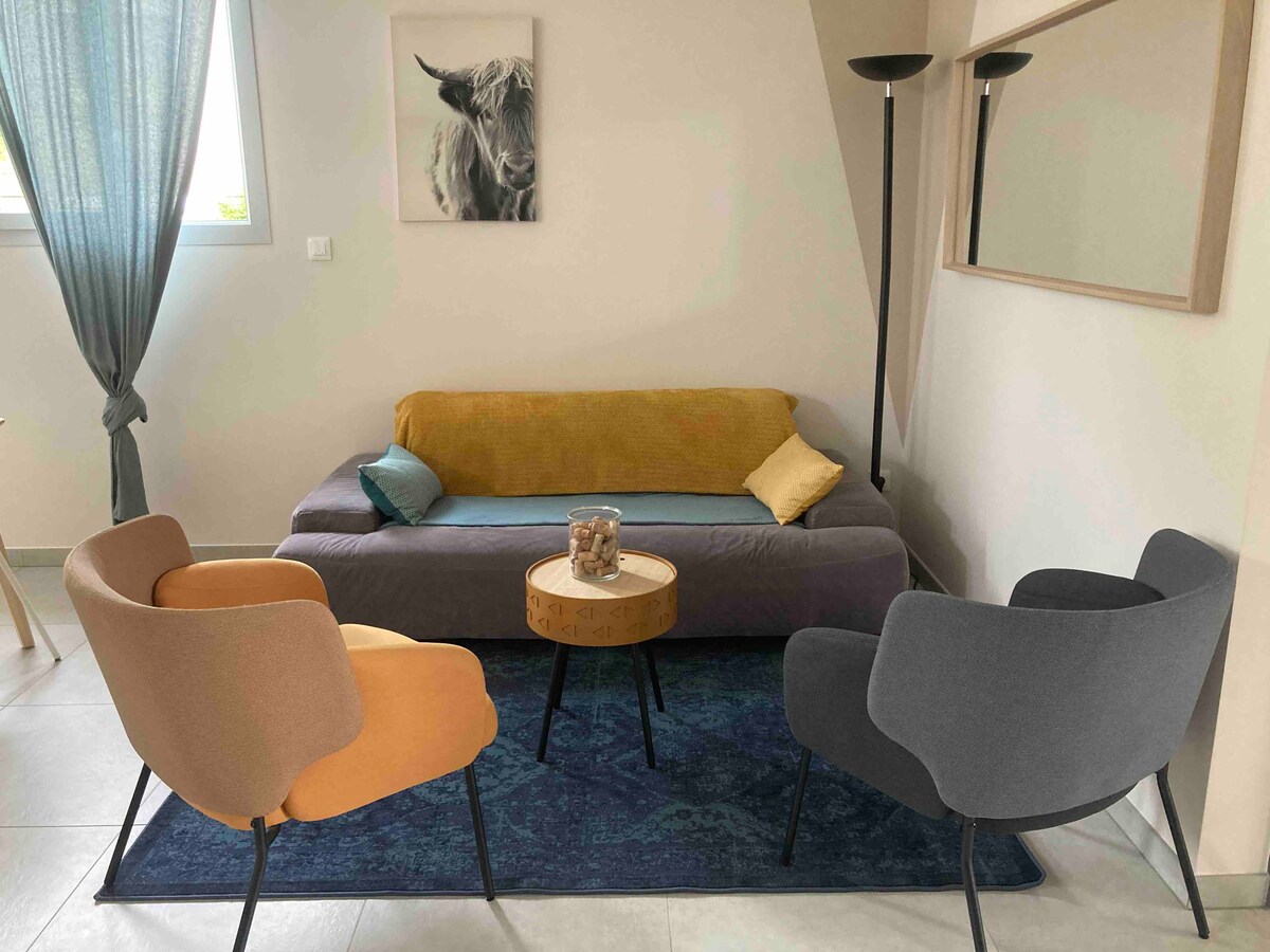 Deze gezinsduplex ligt dicht bij EuroVélo 6 en de Salines-laan en biedt een parkeerplaats met een eigen ingang, een overdekt terras en een groene omgeving. Op de begane grond vind je een grote kamer met open keuken, eetkamer en woonkamer, evenals de badkamer. De familiekamer is gelegen op een tussenverdieping en bestaat uit een tweepersoonsbed (elektrische ontspanningsbedden) en een uitschuifbaar bed. Veilige fietskamer. 2 fietsen voor volwassenen en babyset beschikbaar.