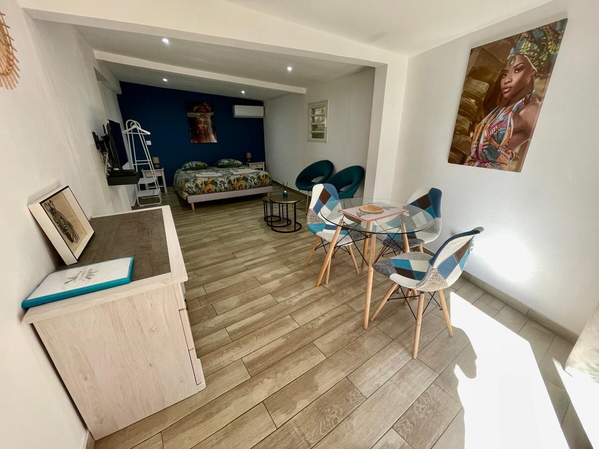 Welkom in onze charmante studio van 30 m², grenzend aan ons Creoolse koloniale huis en omgeven door een weelderige tuin. De studio heeft een eigen ingang en een eigen buitenterras met een jacuzzi. De studio is volledig uitgerust (airconditioning, wifi, queensize bed, beddengoed, enz.) Onze studio ligt op slechts 10 minuten van het strand van Saint-Pierre, evenals het prachtige strand van Grand Anse, en is een ideale uitvalsbasis voor het ontdekken van het wilde zuiden (Cilaos, vulkaan, markt...)