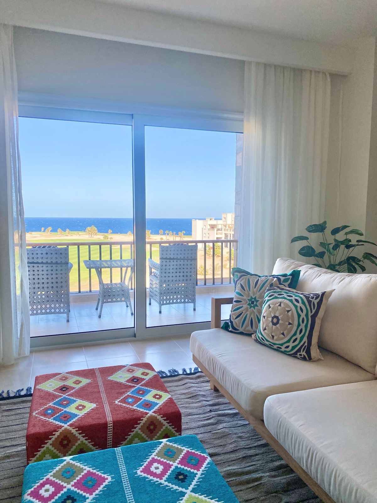 Hurghada vakantie - geniet van je verblijf in modern, strand, super ruim appartement van 90 m ² met open keuken en woonkamer, volledig ingericht met alle benodigdheden voor je comfortabele verblijf in Hurghada. Groot balkon geeft je het beste directe uitzicht op zee/het zwembad en is de ideale plek om naar een magische zonsopgang te kijken. Privéstrand, ligbedden, twee grote zwembaden, groene tuin, wifi 4G-internet, 24 /7-beveiliging en buitenparkeerplaats zijn inbegrepen. **Prijs niet inbegrepen rekeningen voor water en elektriciteit.