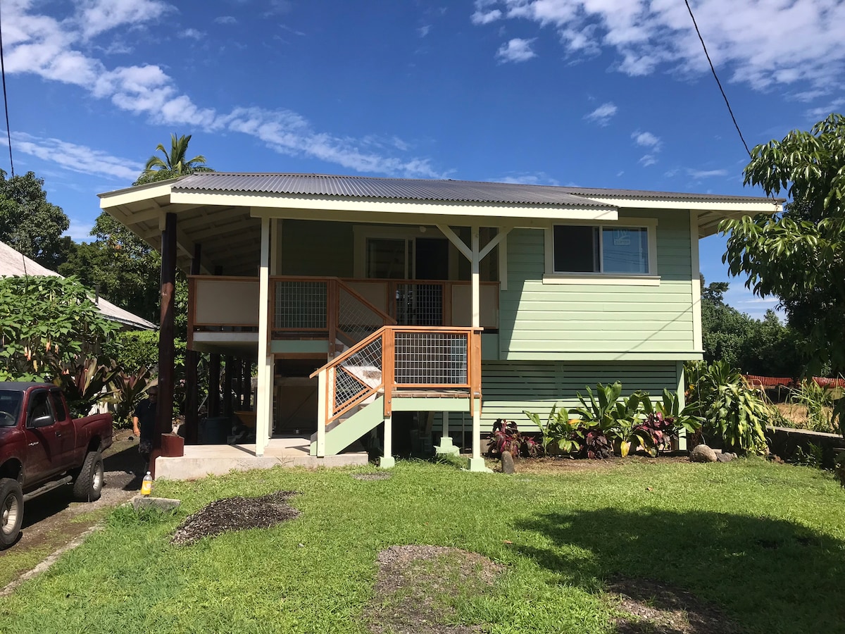 Openlucht Ohana, gebouwd aan de lanai, dicht bij de stad waardoor het gemakkelijk is om je bezoek te plannen. Deze ruime ruimte voor twee ligt op slechts vier mijl van de luchthaven, zeven minuten van het hart van het centrum van Hilo, Saddle road, Walmart, Safeway of het winkelcentrum Hilo. Loop de heuvel op naar het park, een veilige omgeving uitgerust met een basketbalveld en speeltuin, of niet ver weg naar regenboogval, kokende potten of Kaumana-grotten. Een ontspannende, luchtige ruimte voor een rustige vakantie of zakenreizen