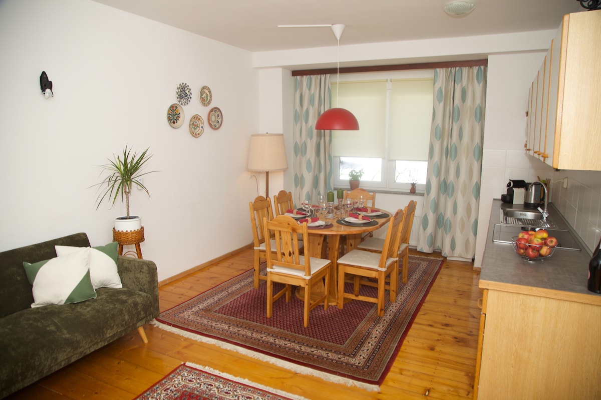 The Holiday apartment Kreuzeck comprises, one double bedroom, lounge, diner with double sofa bed, kitchen with full cooker, fridge,freezer and dishwasher. Bathroom with separate shower. The double bed can be separated into two single beds by prior arrangement. Views to the Kreuzeck, Reisseck ranges. Direct access to the large private south facing garden shared only with the owners and other holidaymakers. Garden furniture and benches available. Private entrance, fully self contained.