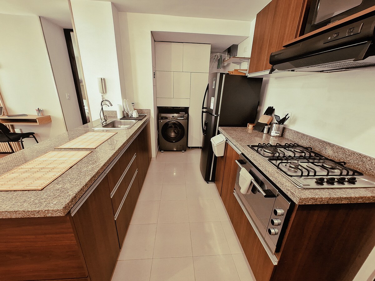 • Strategische locatie: in de buurt van Transmilenio, Centro Histórico, Estadio el Campin, Movistar Arena, Corferias, restaurants en winkelcentra •Kamer met queensize bed, smart tv met apps en eigen badkamer •Sala-Estudio met een slaapbank en een halve badkamer •Wifi glasvezel hoge snelheid 900mb • Balkon kijkt uit over de oosterse heuvels • Wooncomplex met 24/7 beveiliging • Privépark in het ensemble zonder kosten •Keuken uitgerust met koelkast, oven, servies, potten, lepels, messen