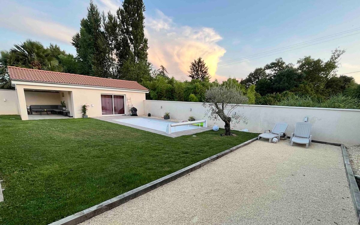 Hallo, Wij bieden een modern bijgebouw gebouwd in 2020, zeer goed uitgerust met een eigen uitgeruste badkamer, een overdekt terras en een verwarmd zwembad aanwezig. Dit bijgebouw is ook uitgerust met een videoprojector voor filmmomenten (Netflix/Canal+). De accommodatie ligt in een zeer rustige woonwijk op slechts 15 minuten van Lyon en op slechts 2 minuten van een ingang/uitgang van de snelweg, dus zeer gemakkelijke toegang.