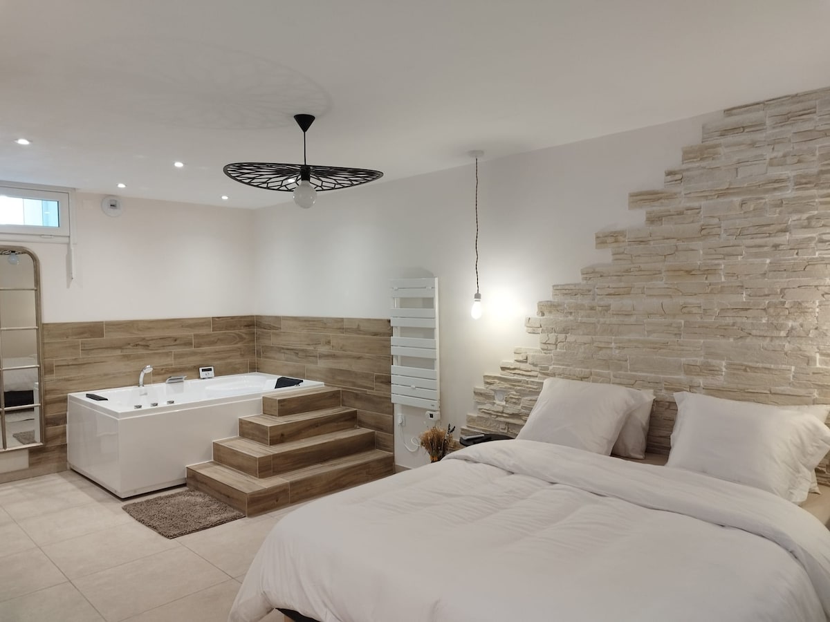 🌹Trakteer jezelf op een pauze van luxe en welzijn in deze unieke stijl suite, genesteld aan de iconische Saône-kades. Dompel jezelf onder in een romantische en rustgevende sfeer, waar elk detail je verblijf verbetert. Geniet van een eigen jacuzzi voor een moment van absolute ontspanning, gesust door de zachtheid van het water en de charme van de oevers van de Saône Of het nu gaat om een romantisch uitje, een onvergetelijke avond of een moment van genezing, deze suite belooft een buitengewone ervaring 🍀