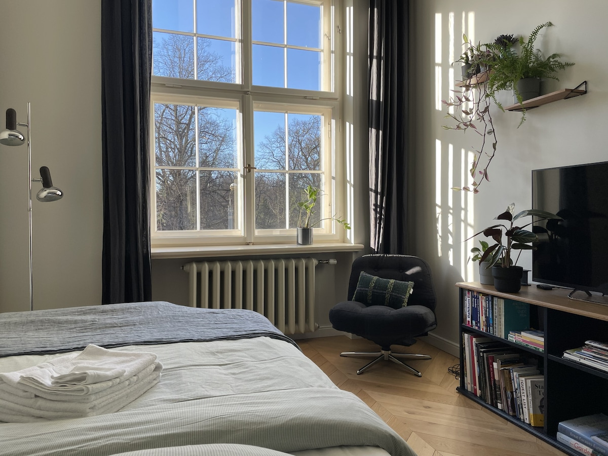 Lichte, rustige studio met uitzicht op de charmante Vērmanes-tuin, met rust aan de parkzijde en weelderig groen in het hart van Riga. De studio is ideaal voor stellen of soloreizigers en bevindt zich in de voormalige Nationale Bibliotheek van Letland, waarbij historisch karakter wordt gecombineerd met modern comfort in een rustige, veilige omgeving. Op slechts een korte wandeling van de oude binnenstad van Riga, geniet van de top bezienswaardigheden van de stad, cafés, wijnbars, restaurants en de chique Berga Bazārs — dicht bij alles, maar heerlijk verwijderd van de toeristische drukte.