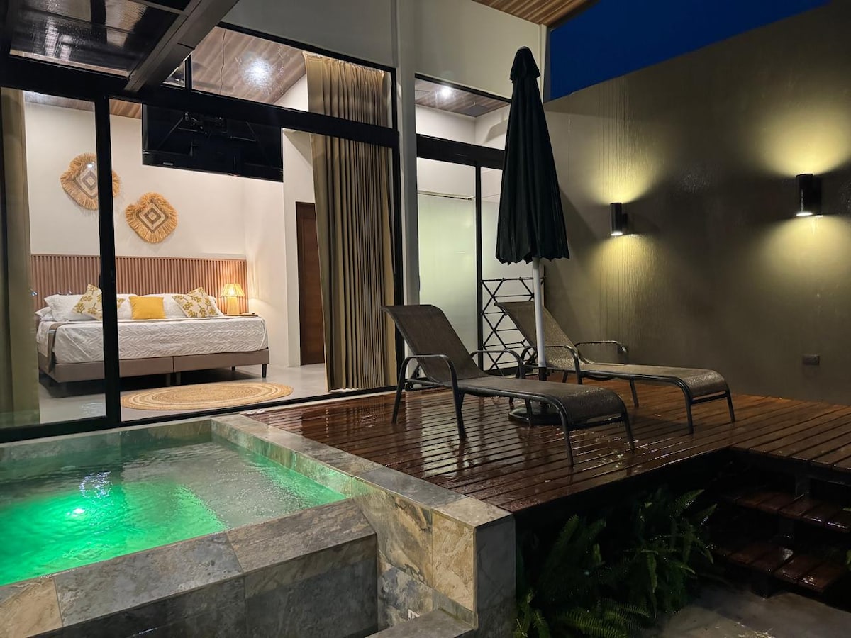 Ontsnap naar je eigen tropische schuilplaats in het hart van La Fortuna! 🌋 🌴✨ Deze stijlvolle villa heeft een kingsize bed, een jacuzzi, een eigen buitendouche en een weelderig regenwoudterras speciaal voor jou. Blijf verbonden met ultrasnelle wifi, ontspan met een 55 inch smart-tv en geniet van volledig comfort met airconditioning, warm water, keuken en privéparkeergelegenheid. Ontworpen voor stellen of avonturiers die op zoek zijn naar luxe, privacy en een onvergetelijke verbinding met de natuur.