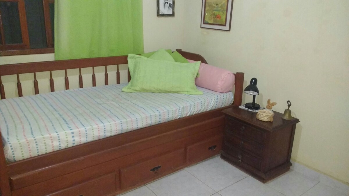 Estacionamento exclusivo. Quarto arejado, c/ventilador de teto, 2 camas de solteiro e dois colchonetes, armário exclusivo c/cabides, bancada para notebook. Numa rua tranquila, localizada à 15 minutos do centro da cidade (praia do centro e comércio) e a 10 minutos da praia do Bosque e da Tartaruga, c/ ponto de van na esquina. Ideal p/quem vem à trabalho ou a passeio e gosta de agitação durante o dia/noite e quer ter uma noite de sono tranquila e acordar ao som de pássaros.
