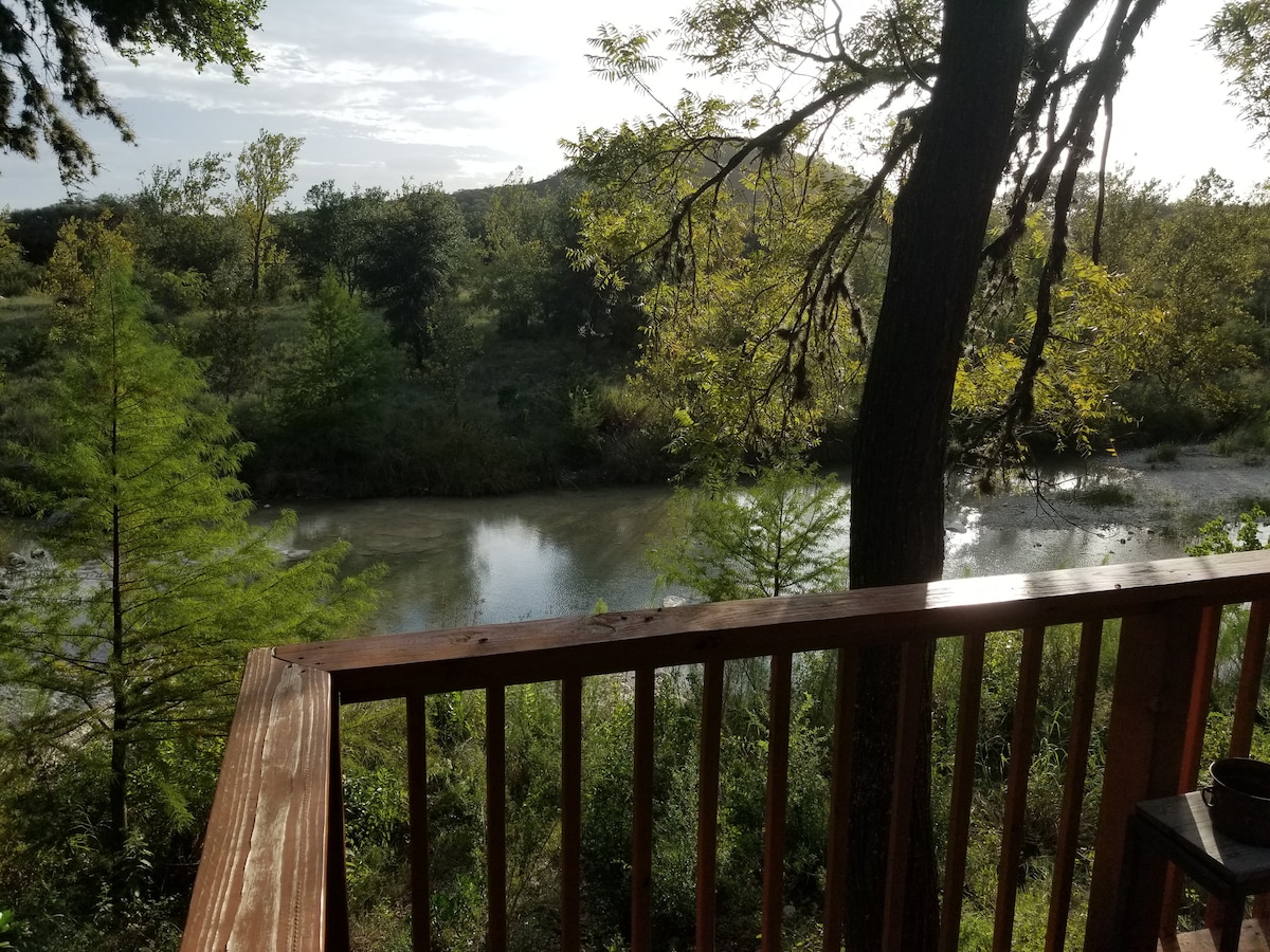Meer dan 250 vijfsterrenrecensies voor onze houten huisjes. Kom ontspannen en word verliefd op dit moderne rustieke huisje direct aan de rivier de Frio. Een perfect uitje in het Texas Hill Country. Onze hutten zijn milieuvriendelijk, mooi interieur, vuurplaats, BBQ grill, een complete moderne keuken, bad en faciliteiten. Gemakkelijk toegang tot de rivier, wandelen, prachtig uitzicht, kajakken, vogelen, nabij Garner State Park, Lost Maples State Park, jagen, vissen. Zomerplezier in de rivier.