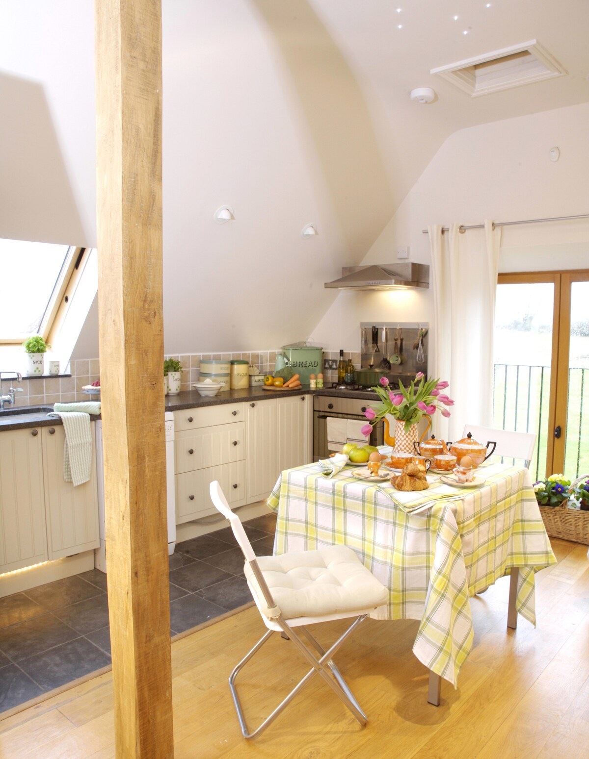 De Dovecote is een mooi loft-appartement op de eerste verdieping van een Cotswolds stenen schuur - perfect voor een romantisch stel of voor een gezin van vier. Kinderen houden absoluut van de twinkelende LED-verlichting in het plafond en het prachtige uitzicht op de tuin. Er is een tweepersoonsbed en twee eenpersoonsbedden voor kinderen in een open ruimte.