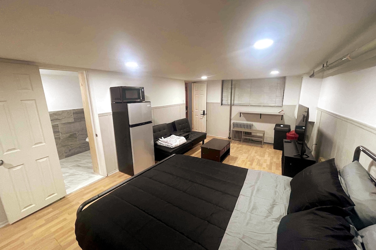 Deze zorgvuldig samengestelde Japandi-geïnspireerde studio is perfect voor werken op afstand of een rustig toevluchtsoord. De ruimte beschikt over een gezellig queensize bed, een kleine loveseat en een zithoek. Geniet van snel internet, tv en een bureau voor productiviteit. De suite beschikt over een kitchenette met een koelkast, een magnetron en een koffiezetapparaat. Gelegen in een rustige, veilige buurt, met toegang tot een vuurplaats in de achtertuin voor ontspanning. Ideaal voor een rustig, comfortabel en productief verblijf.