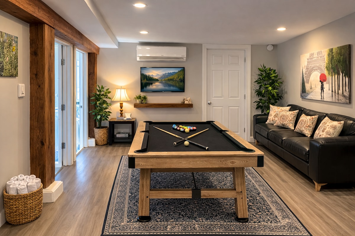 Welkom in ons nieuw gebouwde moderne kelderappartement, gelegen in een serene en geluidsvrije omgeving. Dit uitnodigende toevluchtsoord biedt een eigen ingang die leidt naar een volledig ingerichte woonkamer, een goed uitgeruste keuken en een gezellige slaapkamer met een comfortabel queensize bed en een speciale leeshoek. Gasten hebben ook exclusieve toegang tot de wasruimte, een inloopkast en een wasruimte, die alle gemakken en gemakken biedt van een echte thuis-weg-van-huis-ervaring.