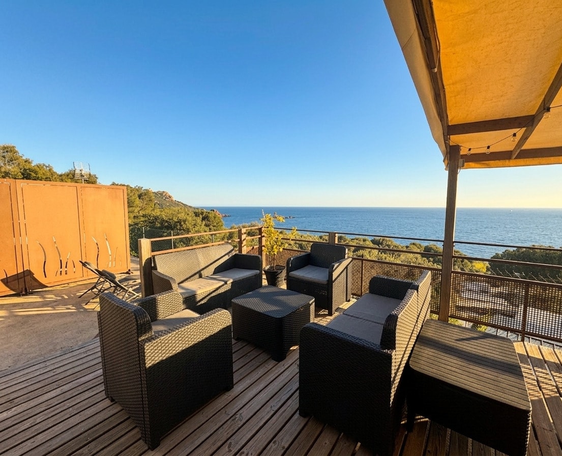 In deze prachtige Lodge geniet je van een droomlocatie die openstaat voor de natuur met 2 prachtige houten terrassen met een adembenemend uitzicht op de zee!! Met 2 grote ramen van 2,50m zul je genieten van de rust van dit paradijs binnen het campingdomein 4* * ** de l'ile d' or. Twee slaapkamers (1 bed 140/200 en 3 bedden 90/200), een badkamer met XXL inloopdouche, een apart toilet, een uitgeruste woonkamer met airconditioning open naar buiten, je gaat niet meer weg..!