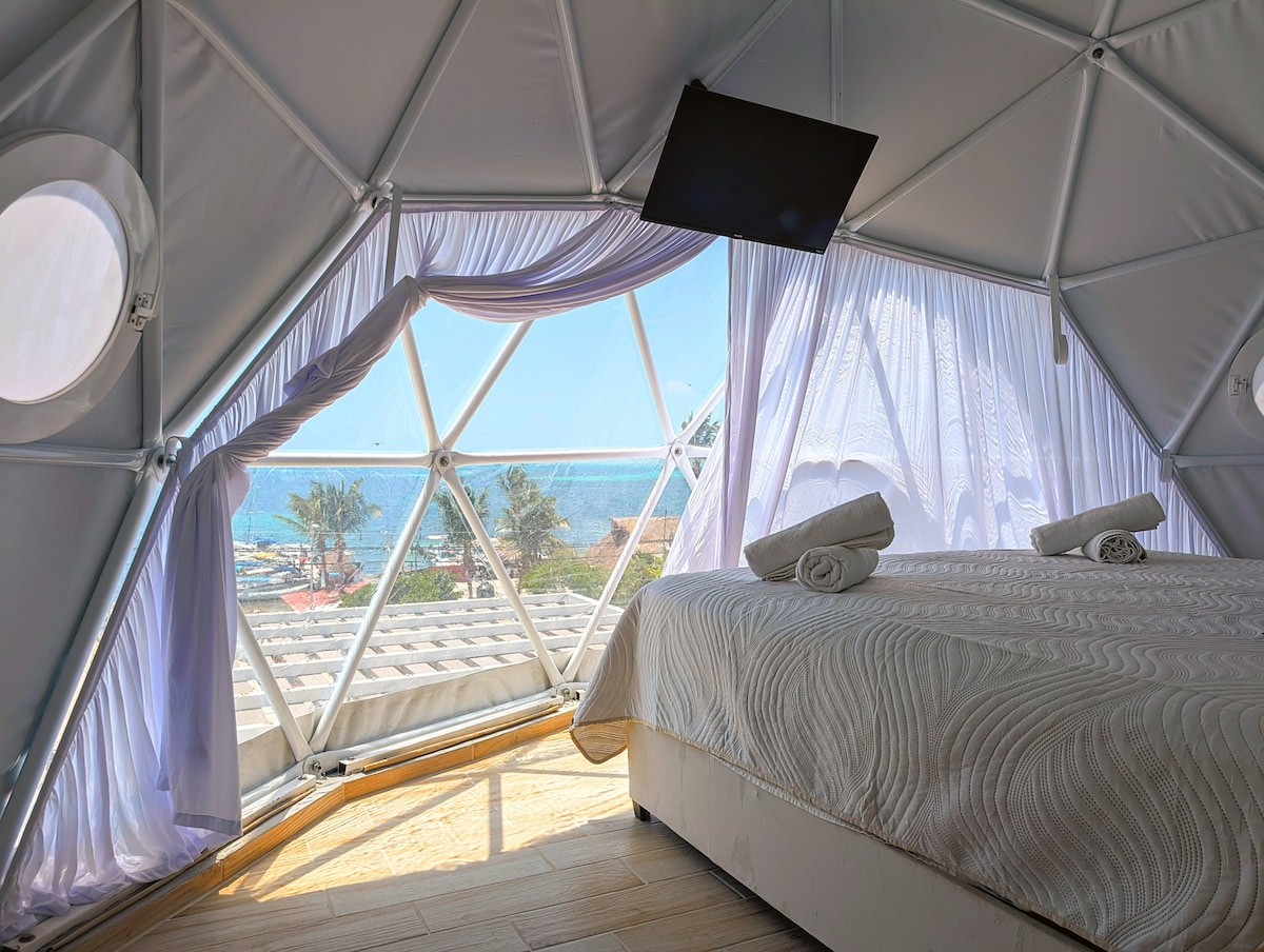 Disfruta de este exclusivo Domo con vistas al mar Caribe 🌊 y al amanecer 🌅 El único en todo Cancún ✨ 🔸 Ubicado en un condominio privado 🛡️ 🔸 A unos pasos de la Playa del Niño🏖️ 🔸 A minutos caminando del ferry a Isla Mujeres 🏝️ Alejado del turismo masivo, pero bien conectado con las mejores playas, restaurantes y actividades de la Riviera Maya. Incluye servicio de Concierge 🛎️ gratuito para ayudarte a organizar todo en tu viaje.