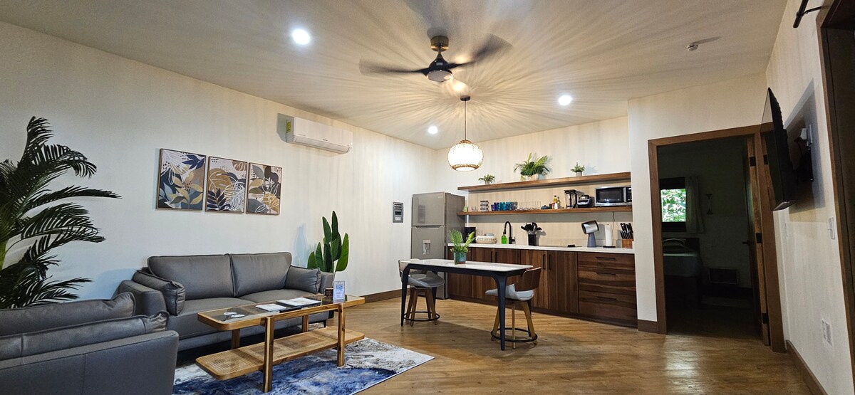 Deze geweldige ruimte ligt aan het zwembad en is een groot open concept met gewelfde plafonds. De suite heeft een queensize bed en een goed ingerichte badkamer. Het beschikt over een complete keuken met alles wat je nodig hebt voor een verblijf. Het heeft een ruim woonruimte en een apart eetgebied. Breng je dag door in ons overloopzwembad en bubbelbad, omringd door een tropisch bos en landschapsarchitectuur, op steenworp afstand van het strand. Er zijn twee 5-sterrenrestaurants direct onder ons op het strand voor je eetgelegenheid