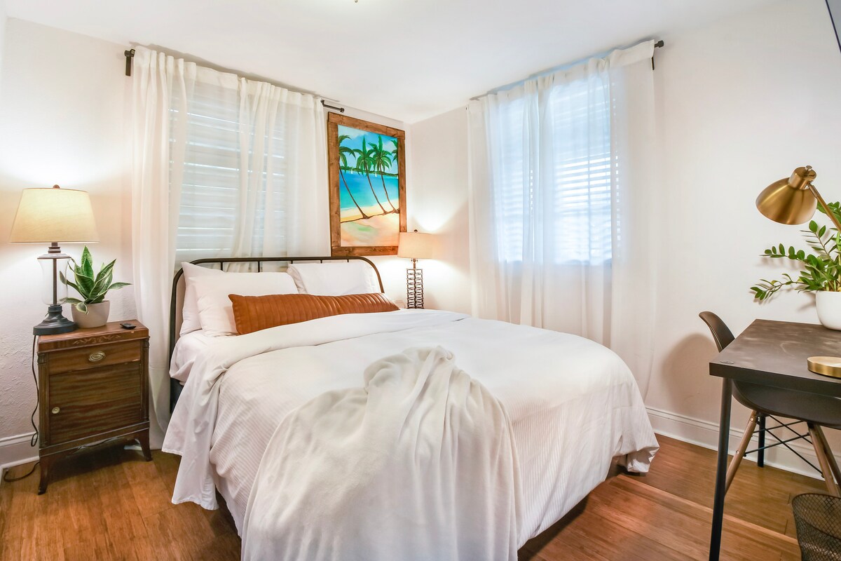 Beautiful historic bungalow located in the heart of Tampa, close to everything the city has to offer. Featuring a rustic boho design, our home provides a relaxing retreat just 5 minutes from Downtown Tampa. Enjoy the convenience of free parking and easy self check-in, along with a fully stocked kitchen, SMART TVs, and a laundry room. The bohemian atmosphere makes it ideal for vacations, romantic getaways, family visits, concerts, sporting events, or work trips.