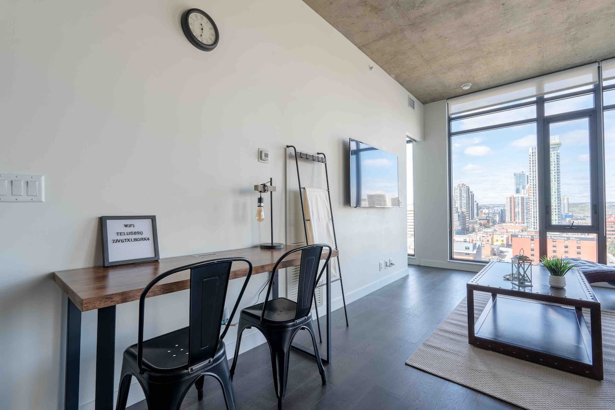 Welkom bij The Biosphere Loft — een prachtig penthouse met twee verdiepingen, 22 verdiepingen boven het centrum van Calgary, met onwerkelijk panoramisch uitzicht op de skyline vanuit bijna elke kamer. Begin je ochtenden met koffie op een van je twee eigen terrassen en ontspan 's avonds in het bubbelbad in spa-stijl terwijl de stadslichten eronder gloeien. Perfect voor Stampede-reizen, concerten, zakelijke verblijven en verhoogde weekenduitjes — met beveiligde ondergrondse parkeergelegenheid inbegrepen.