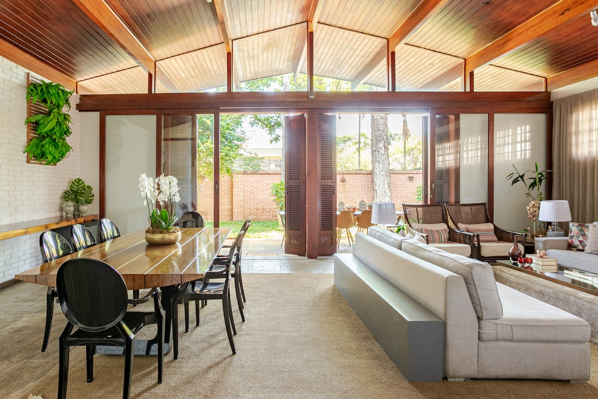 Met een wintertuin die de ruimtes verdeelt, voel je je in een hoek van ontspanning en entertainment, zwembad, spa, bubbelbad, geluidsapparatuur, kabel-tv met alle beschikbare kanalen, open haard in de 2 kamers, containers voor vuurkorven buiten, tv en stereo in de slaapkamers. Topkwaliteit beddengoed en handdoeken. Volledige keuken. In de buurt van Shopping Eldorado en Iguatemi en 2 pleinen met veel natuur.
