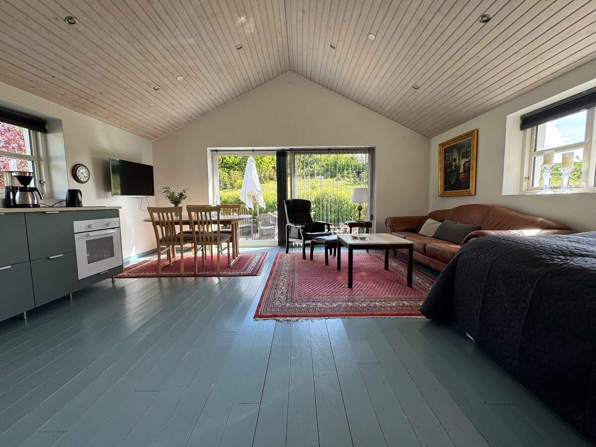 Welkom in ons gezellige appartement met één kamer op het platteland. Het appartement is gelegen in een apart bijgebouw in verband met ons huis (we hebben twee appartementen in hetzelfde bijgebouw). Je hebt dus je eigen plek met een volledig uitgeruste keuken, een badkamer, een terras en een kleine groene ruimte. Het terras en de groene ruimte worden gedeeld met het andere appartement in het bijgebouw. Geniet van een aantal ontspannende dagen in vrede en stilte. We hopen je graag te ontmoeten.