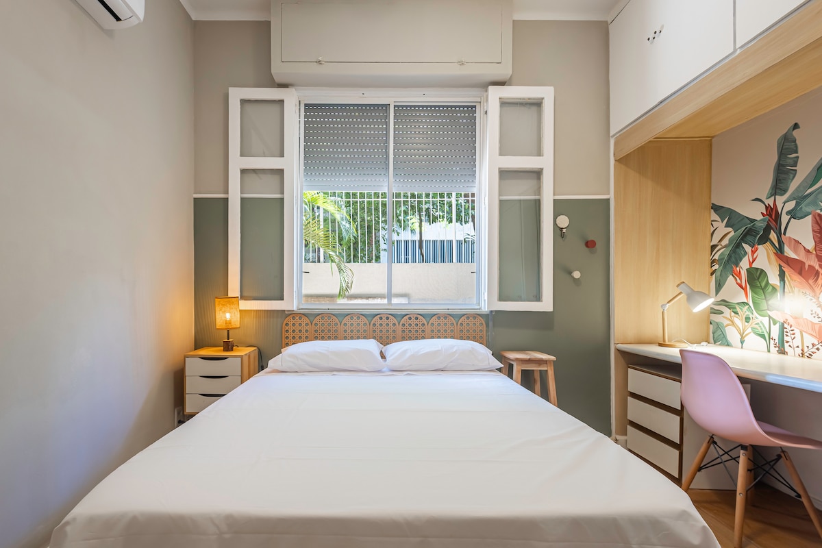 (Geheel appartement!) Onze rustige, comfortabele ruimte is klaar voor je! Je hebt een keuken met een wasmachine en een vaatwasser, een zonnige woonkamer met terras en een spa, een eigen slaapkamer met geluiddichte ramen, een queensize bed, glasvezelbreedband, WIFI en een eigen badkamer met bad en douche. Botafogo is extreem beloopbaar en er is genoeg openbaar vervoer vlakbij. Wij liggen op twee minuten lopen van de metro! Ontspan, ontspan en geniet! We hopen dat u geniet van uw verblijf bij ons!